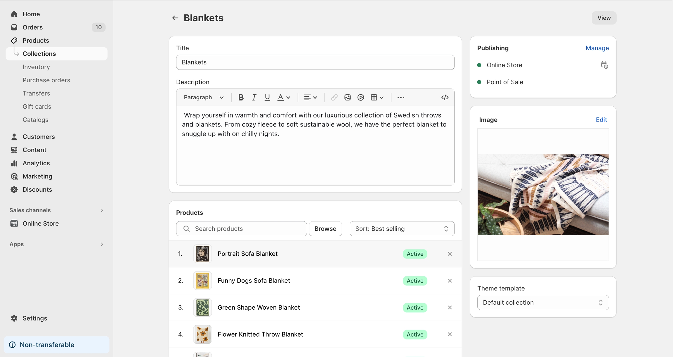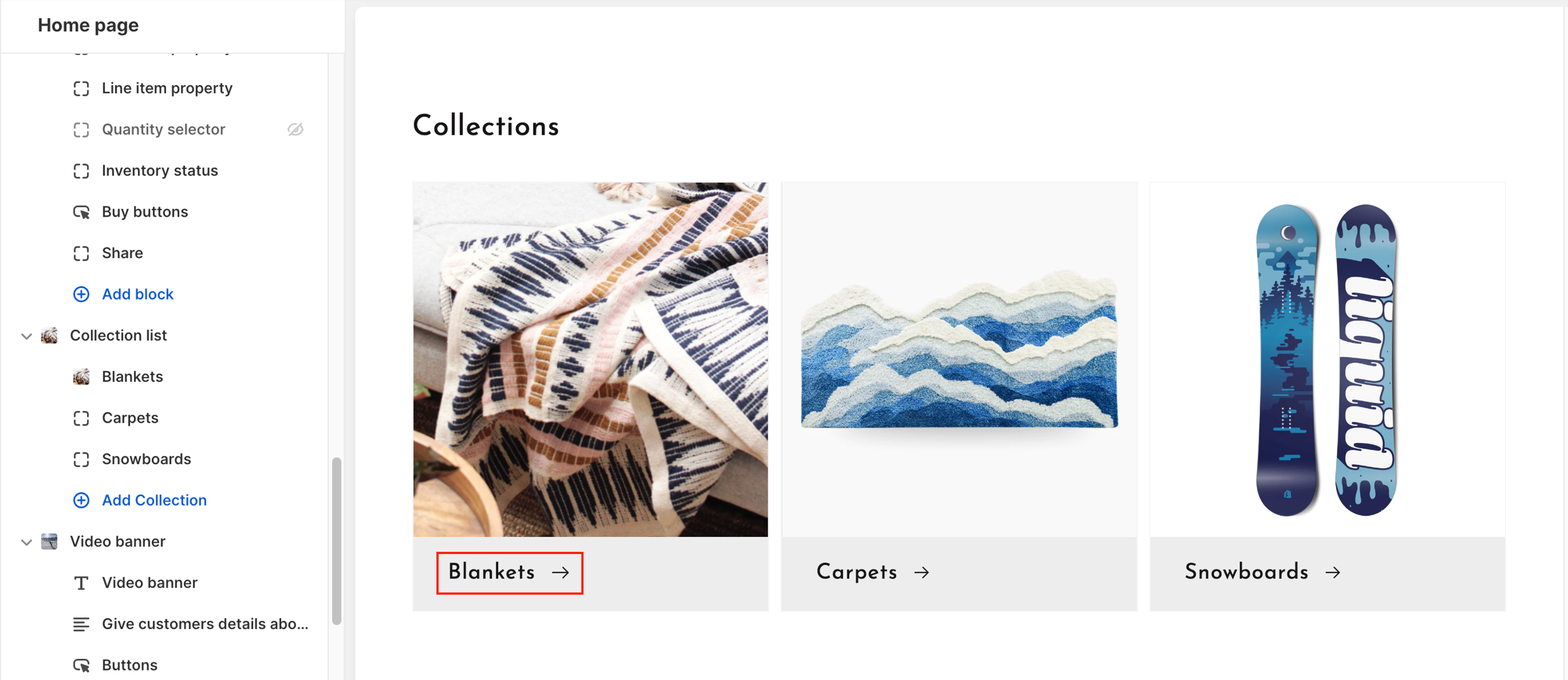 In the theme editor, click on the Collection that you intend to edit. (e.g. Blankets)