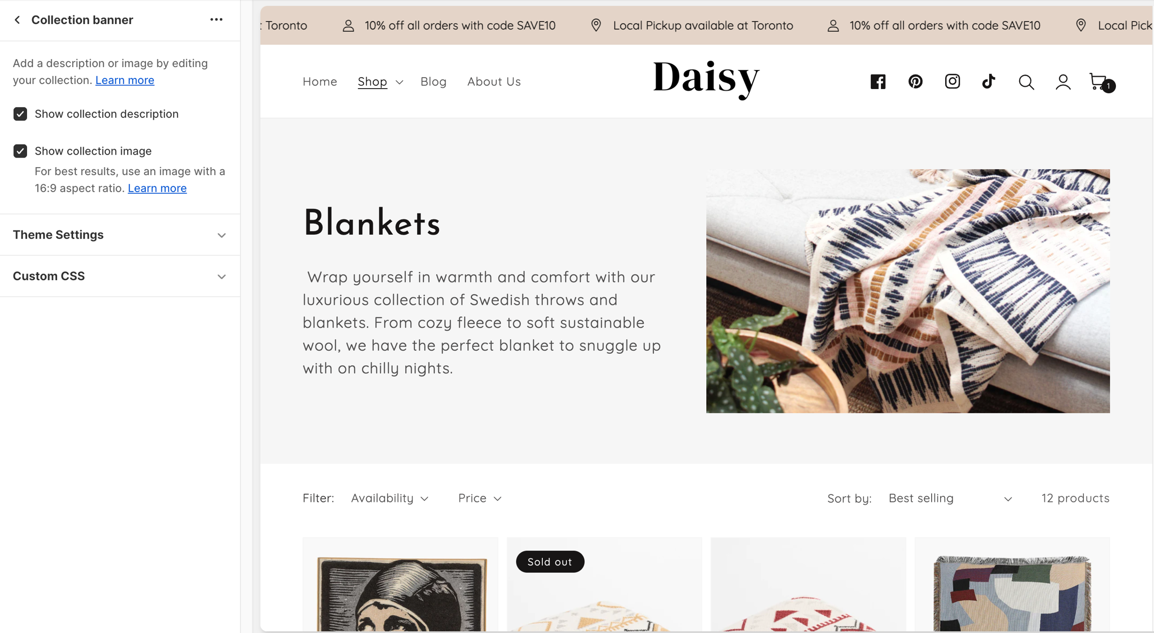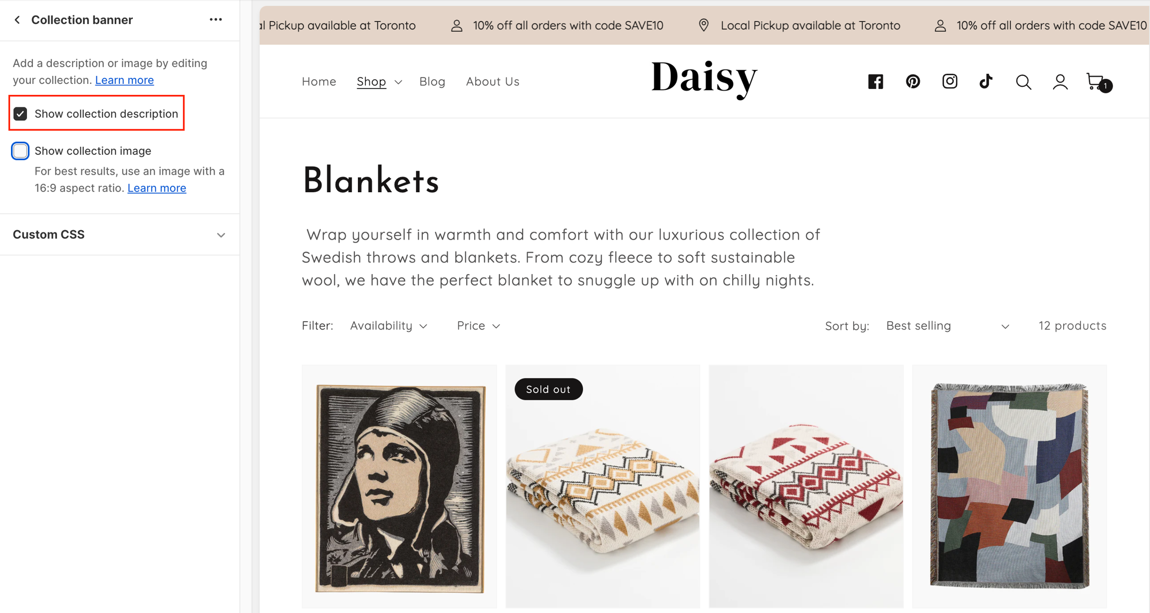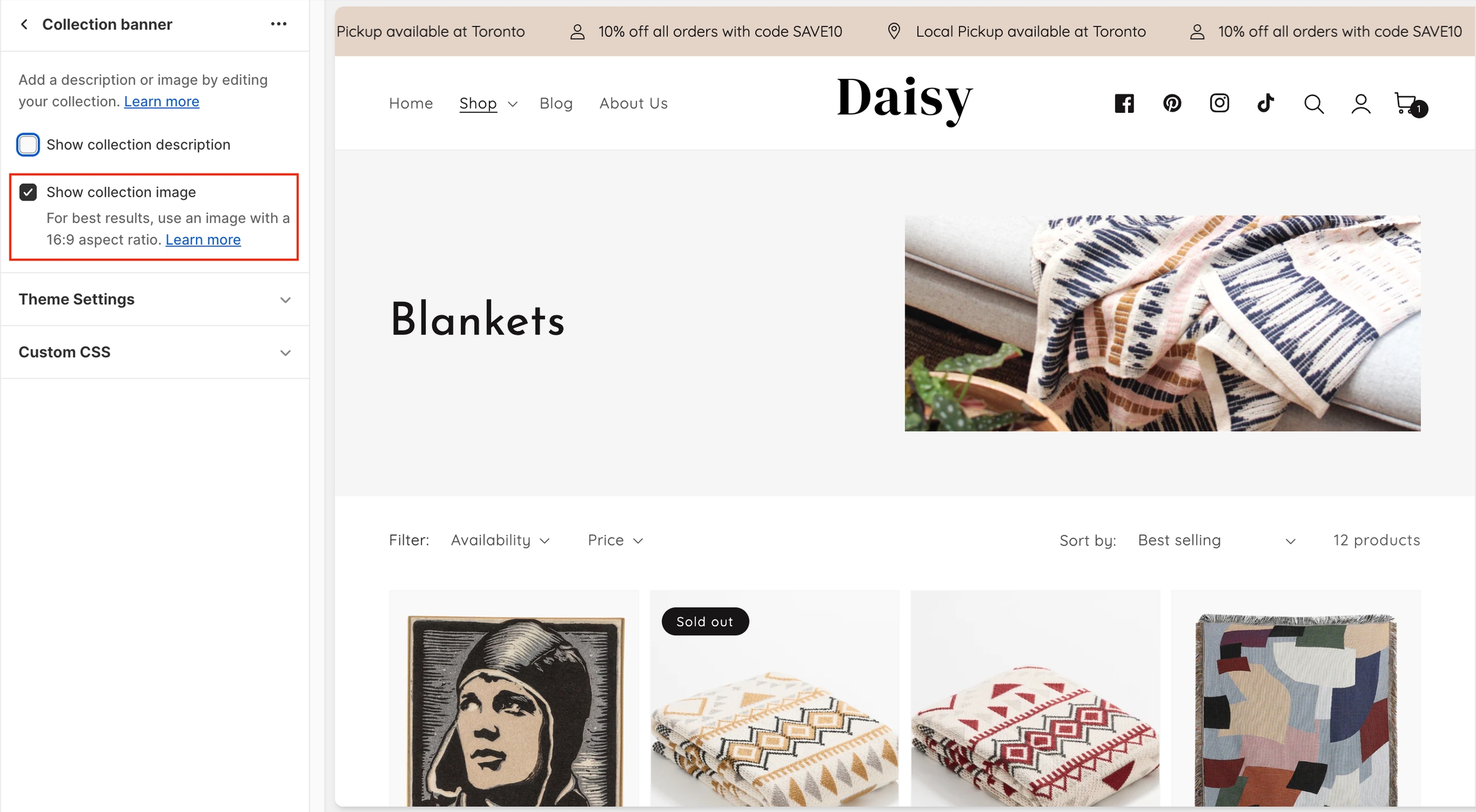 The Collection banner setting can display the collection image and collection description that you added in your collection settings, on the collection page.