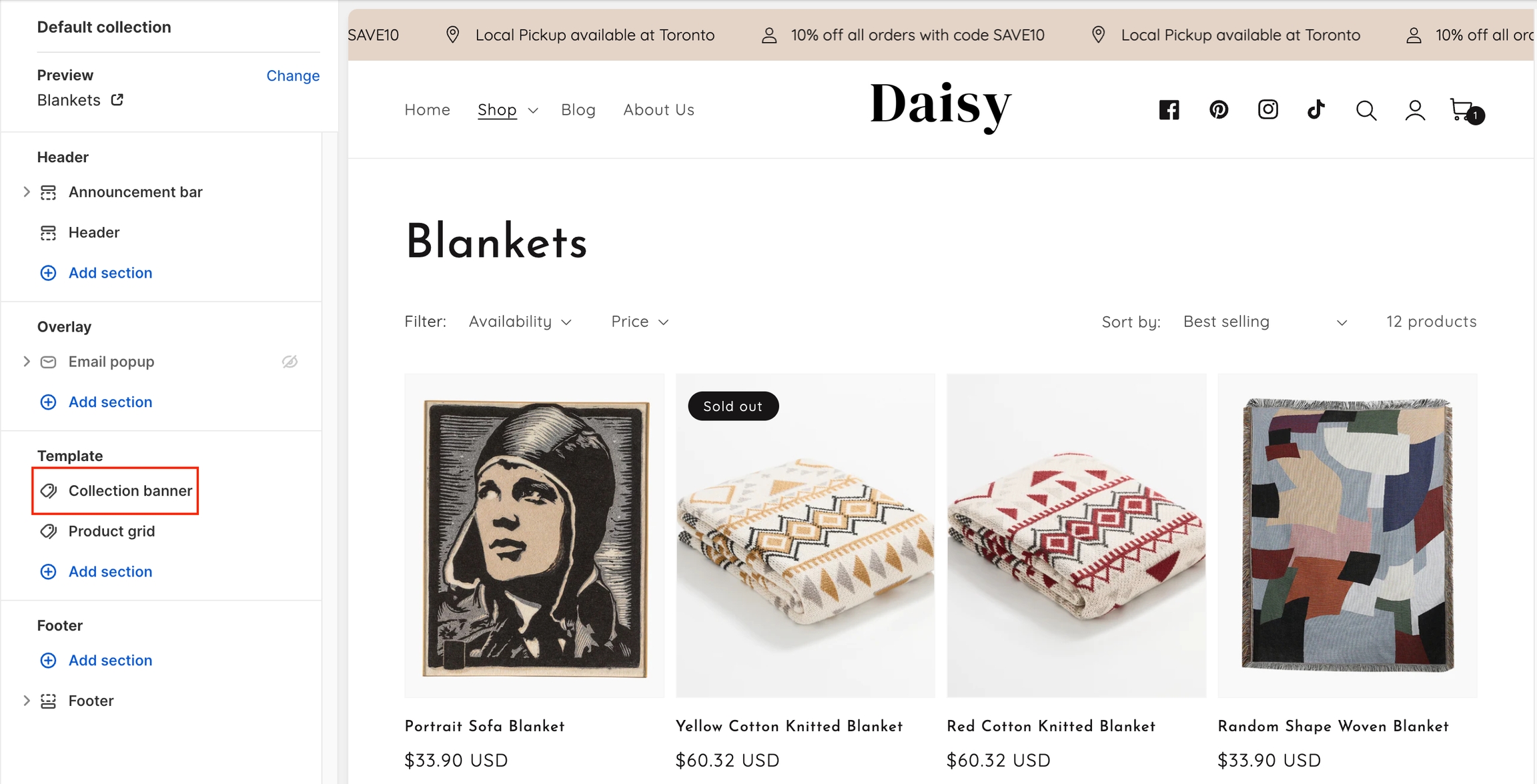 On the left sidebar, click on the Collection banner section to open the section settings.