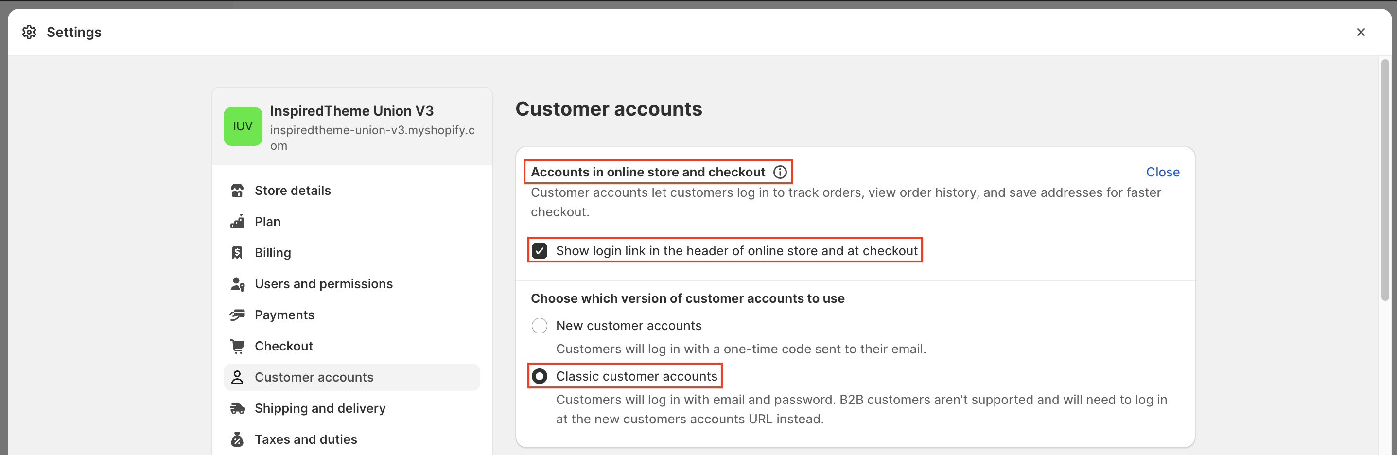 2. In **Accounts in online store and checkout >** Enable **Show login link in the header of online store and at checkout.**