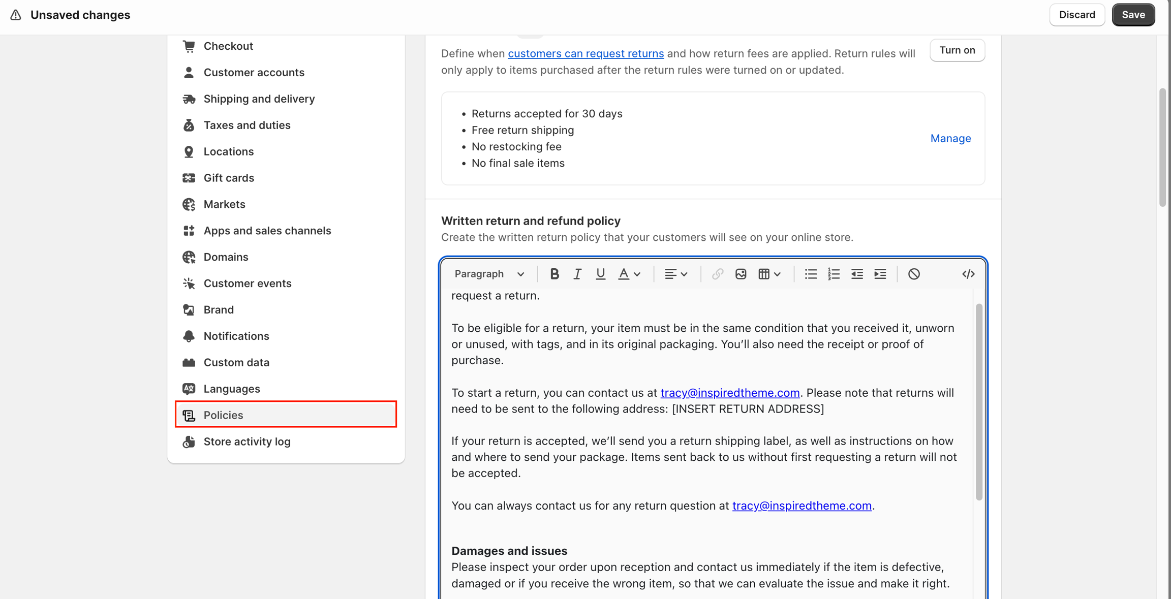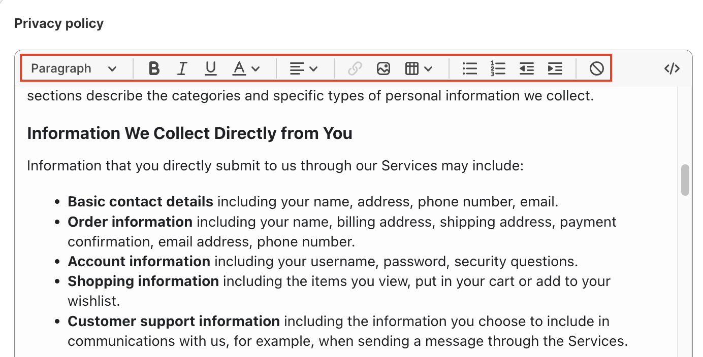 You can add or edit policies for your store. Although Shopify can generate templates, you're responsible for following your published policies. Review your policies carefully before adding them.