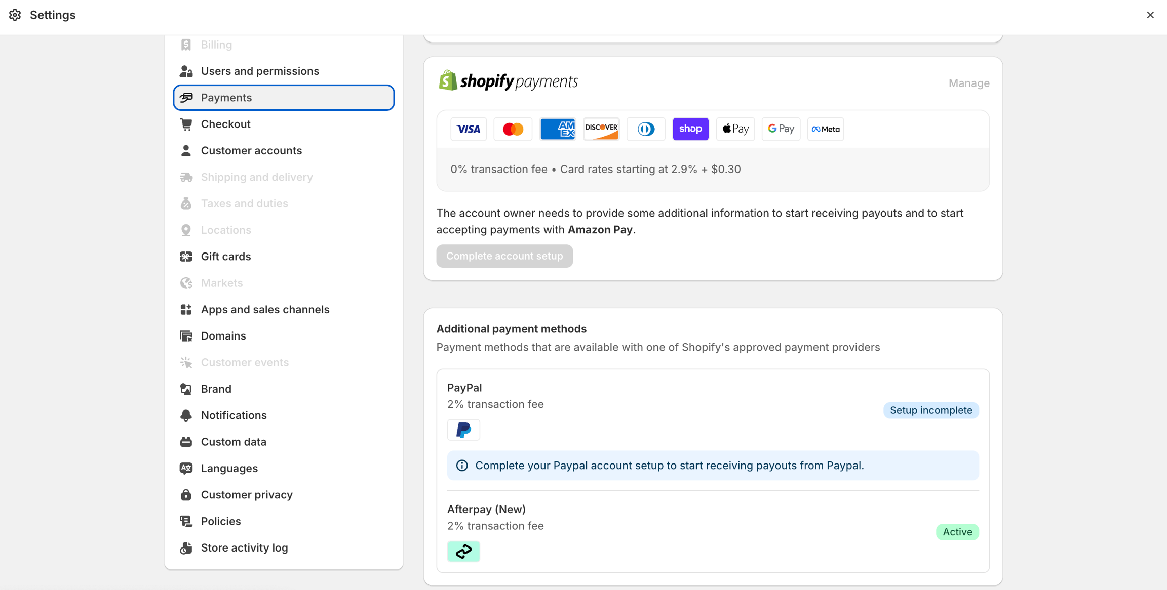 If you haven't set up a credit card payment provider on your account, then click Complete account setup in the Shopify Payments section.