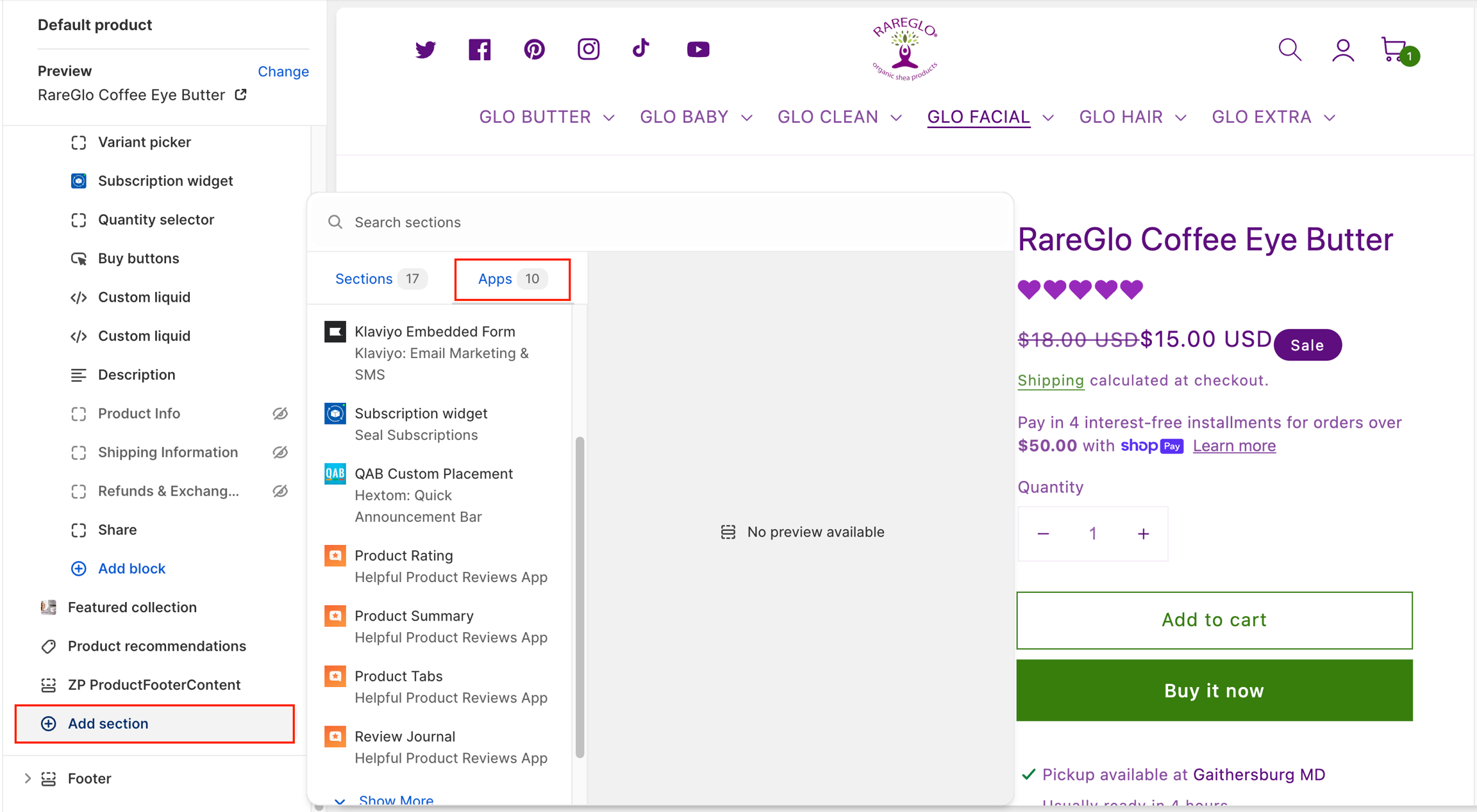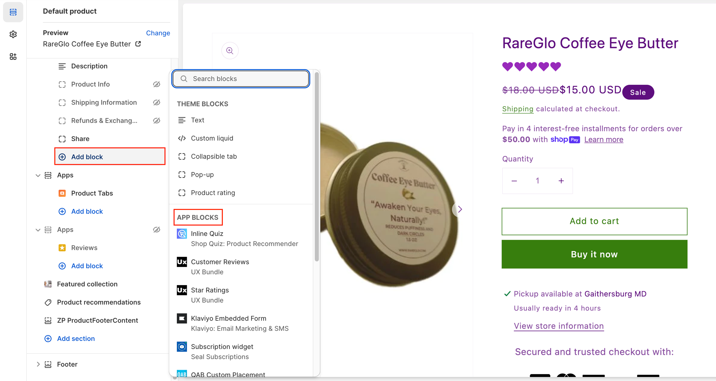 Apps can be added both as blocks in a section, and as sections in a template. This lets you add app functionality exactly where you want to use it on a page. App blocks can be added, removed, repositioned, and customized through the theme editor.App blocks might only be compatible with certain page types. For example, a size chart app might only be compatible with product pages.