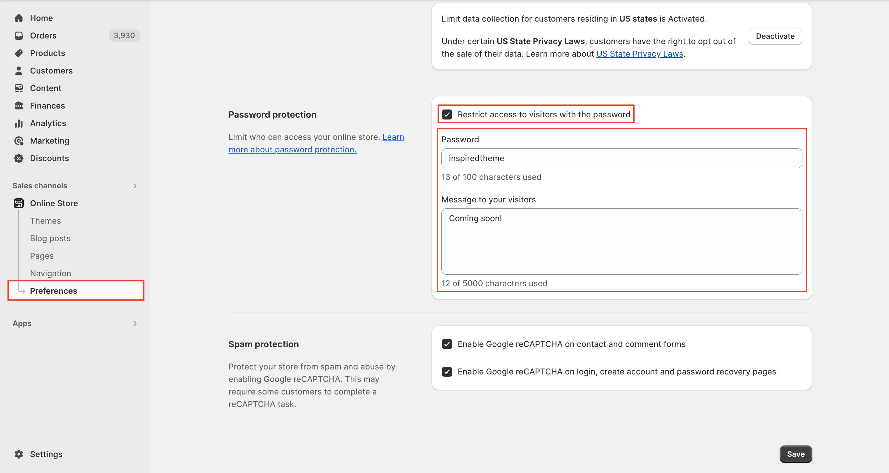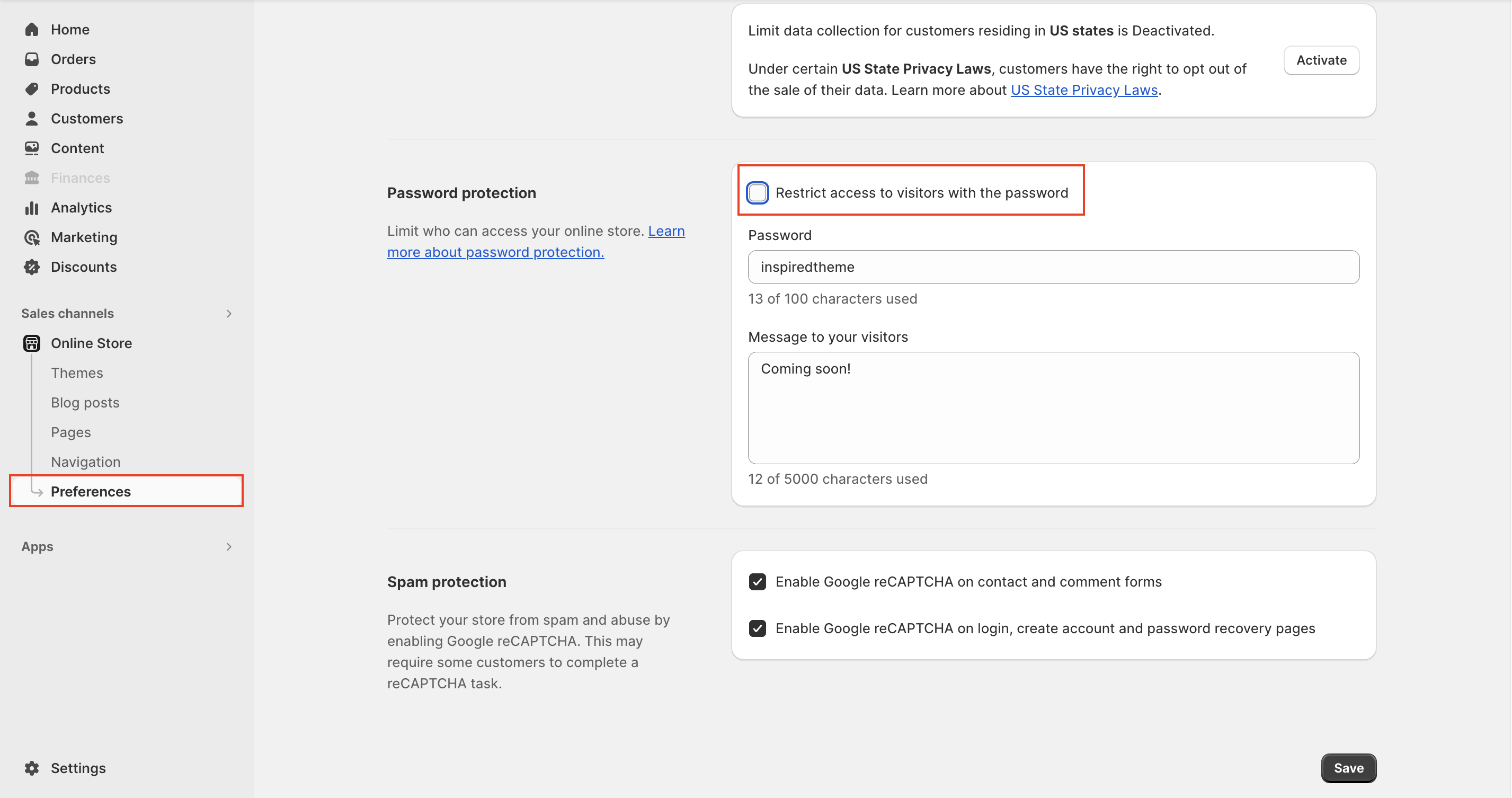 There are two ways to remove your online store password: from your **Themes** page or from the **Preferences** page under **Online Store** in your Shopify admin.