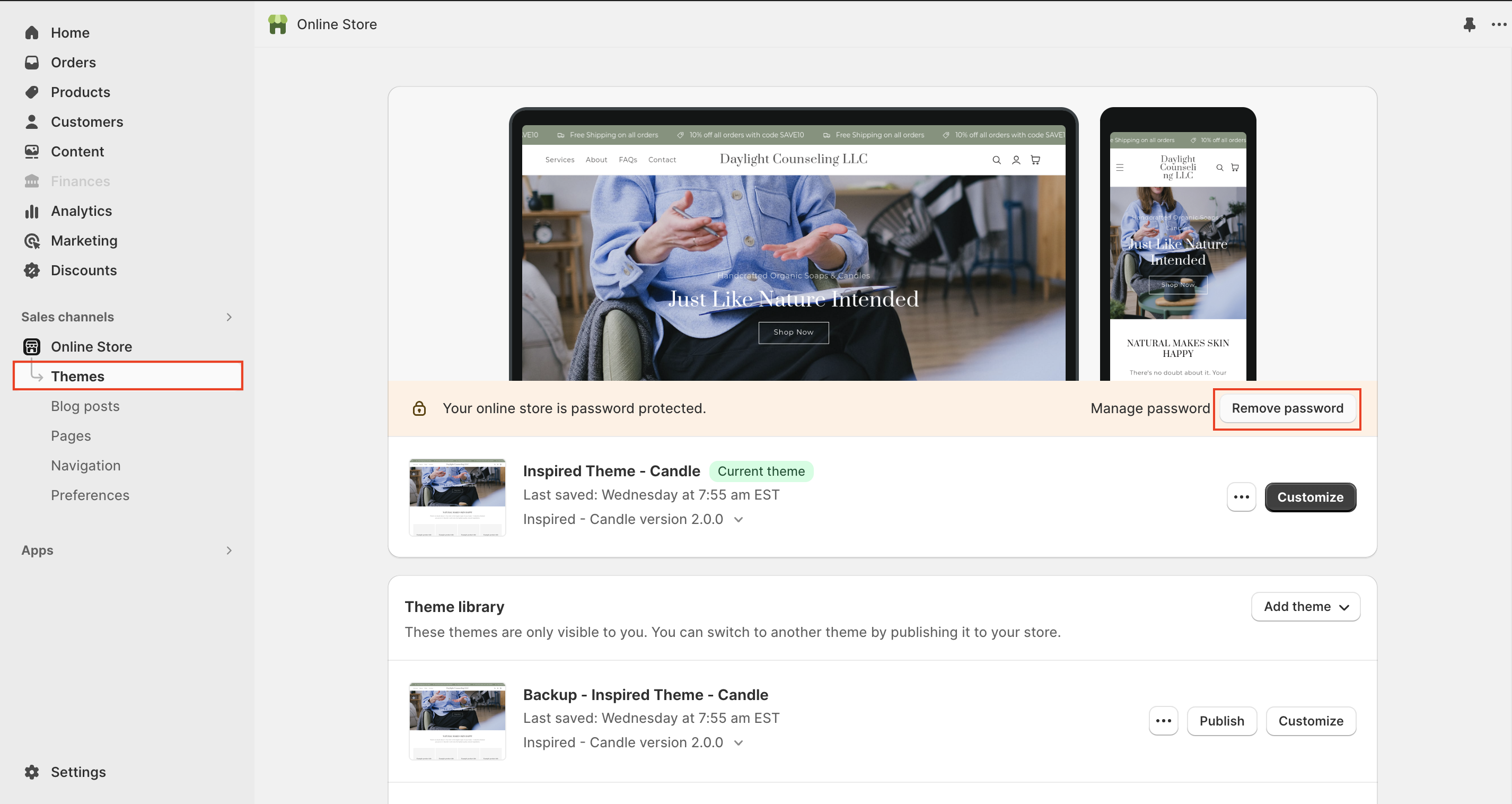 * There is a banner displayed that says, "Your online store is password protected." Click **Remove password**. If the banner isn't displayed, then your online store isn't password protected.