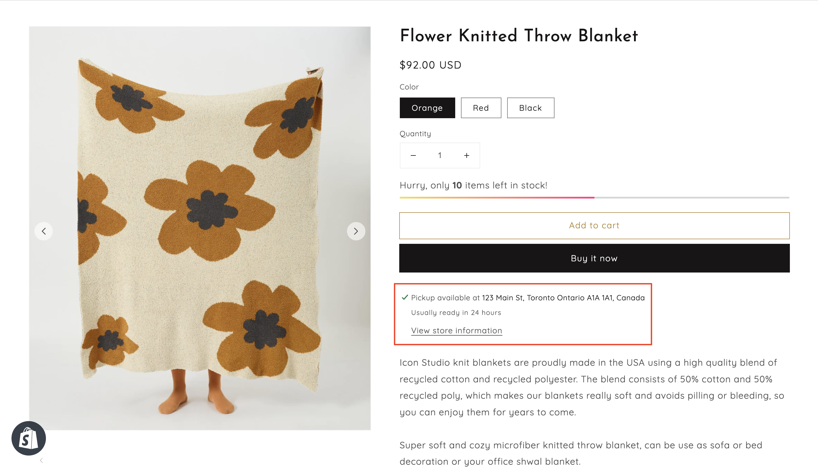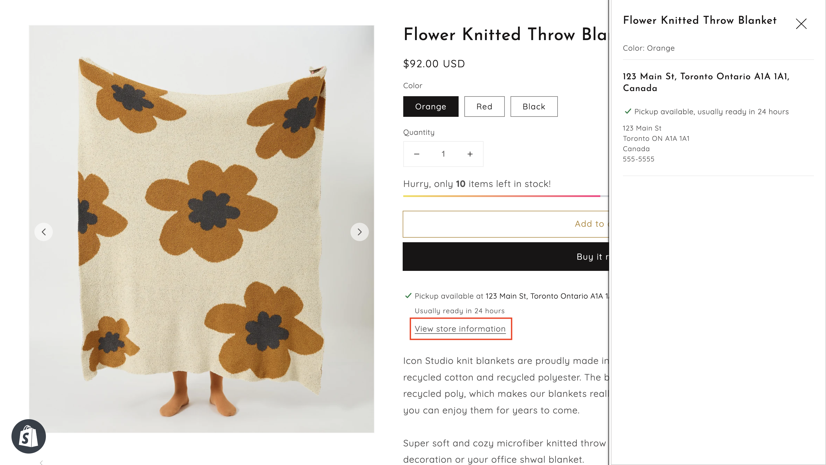 If you have local pickup enabled for only one location, then the location and pickup availability is displayed for that location. Customers can click **View store information** to learn more about the pickup location.