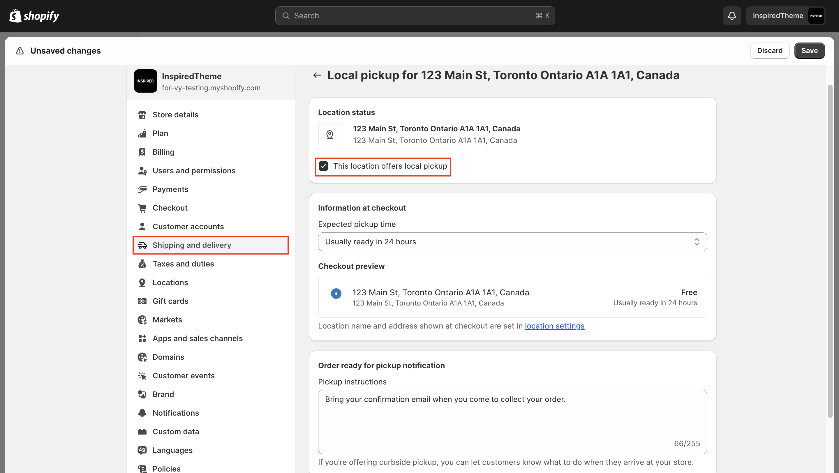 * Under **Order ready for pickup notification**, enter pickup instructions for customers (Optional).