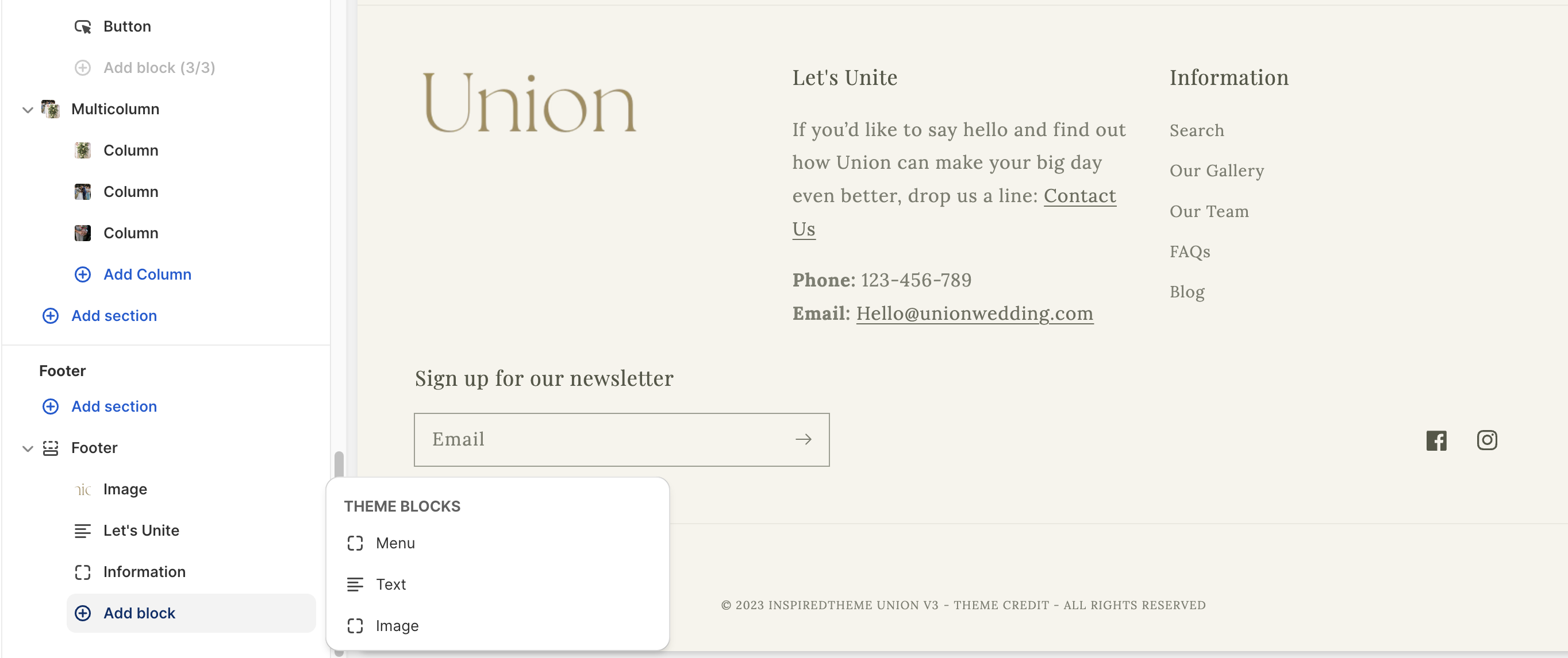 You can add three different types of **blocks** and re-arrange them in your Footer: Menu, Text, and Image. &#x20;
