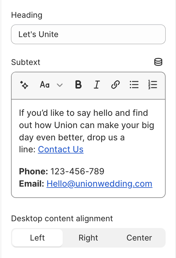 You can add a brief title to the **Heading** field and a short paragraph to the **Subtext** field (use the formatting options to add bold, italic, and linked text.)