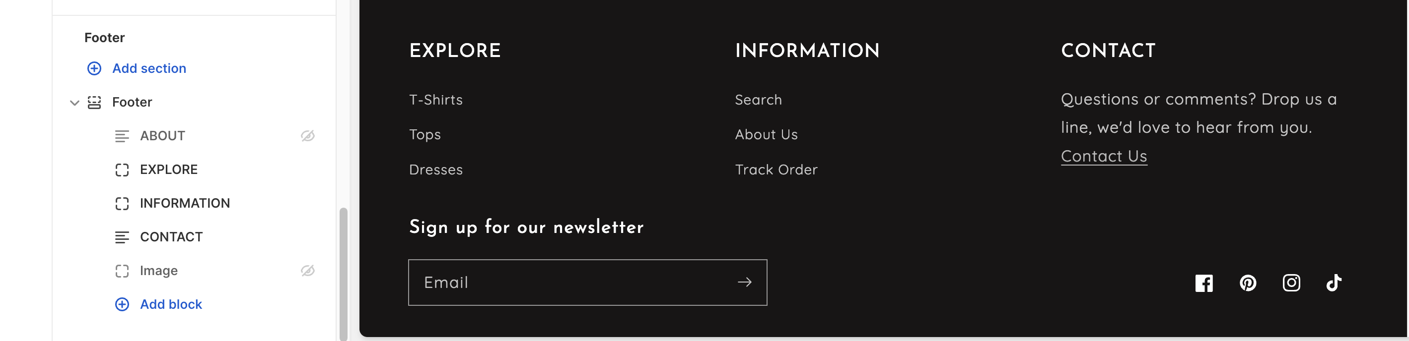 * Expand a section node using the expand icon ">" to view its blocks, or collapse it using the collapse icon "**∨"** to hide the blocks. You can click any section or block to view its settings.