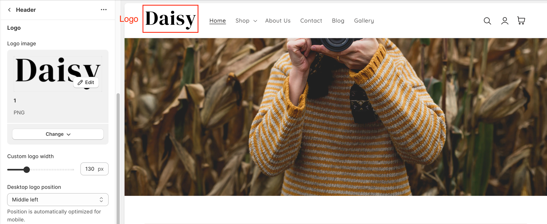 Use the Custom logo width slider to change the size of the logo in the header.