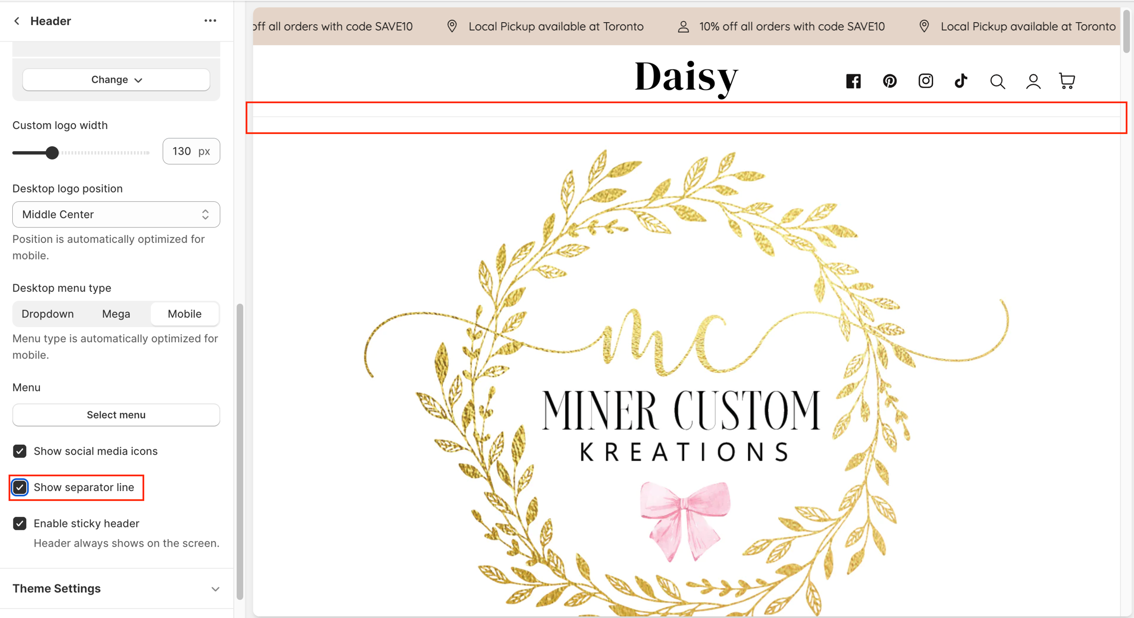 Check the box Show separator line to show the separator line (clickable icons) below your header.