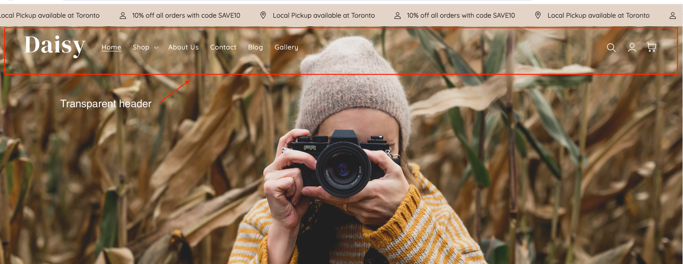 You can make your store's header transparent on your Home page to display your Slideshow, Video banner, or Image banner section at the top of the page.