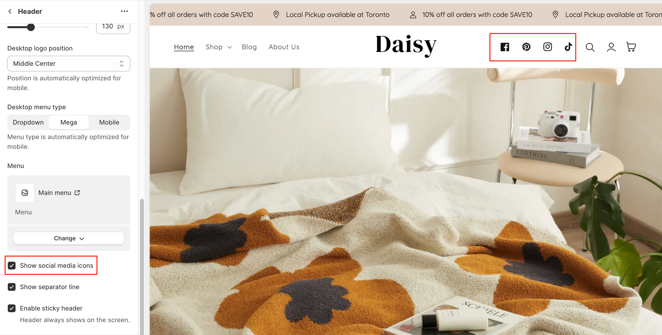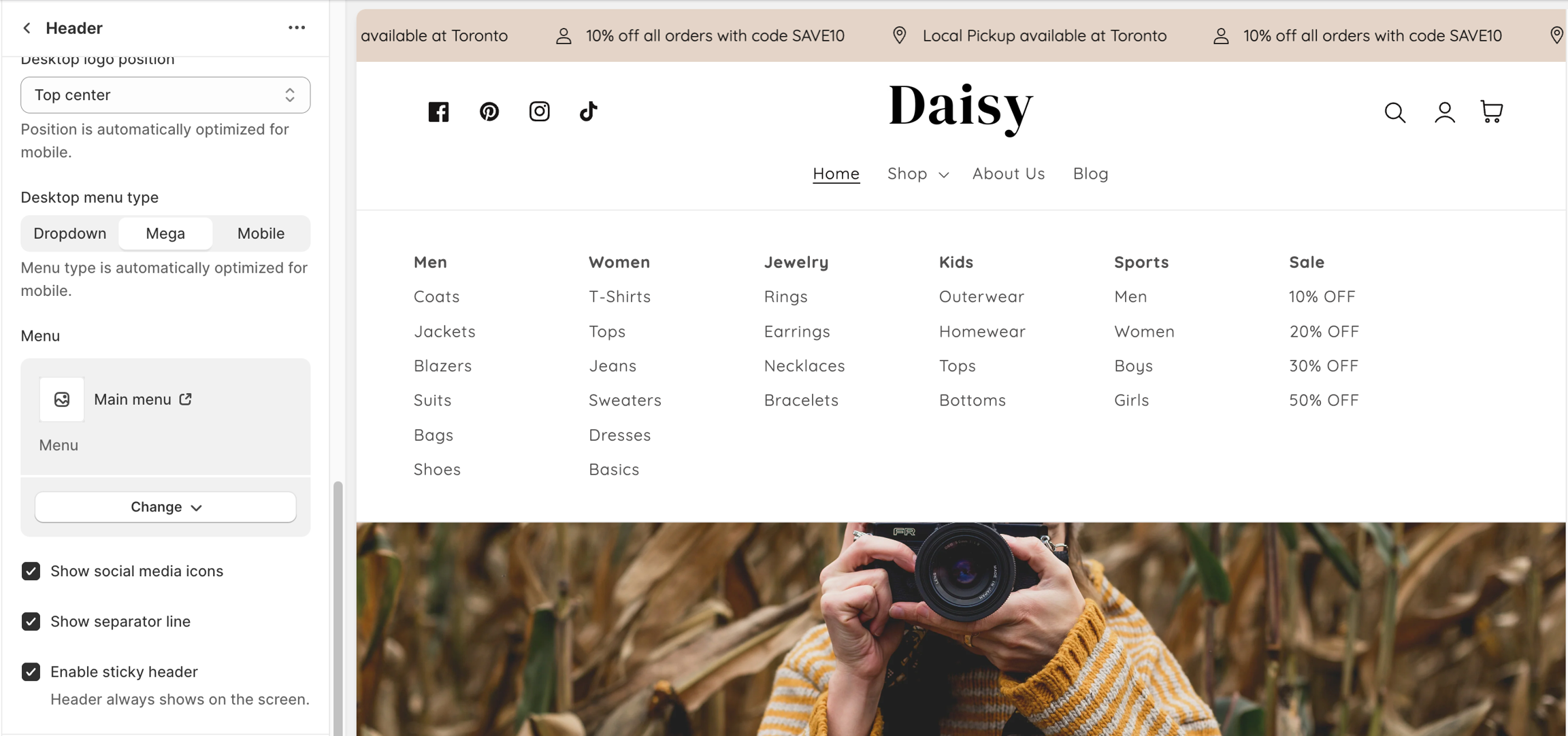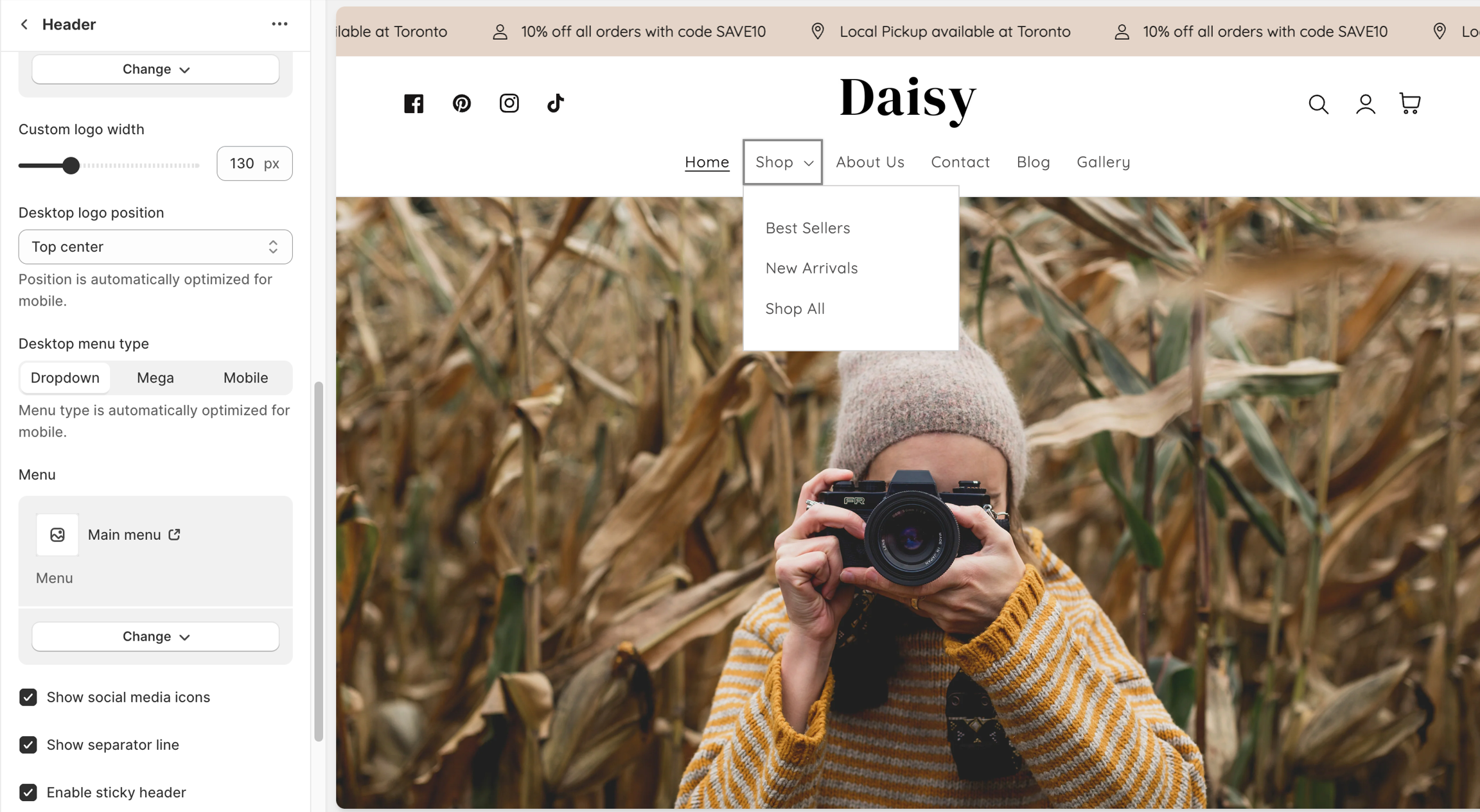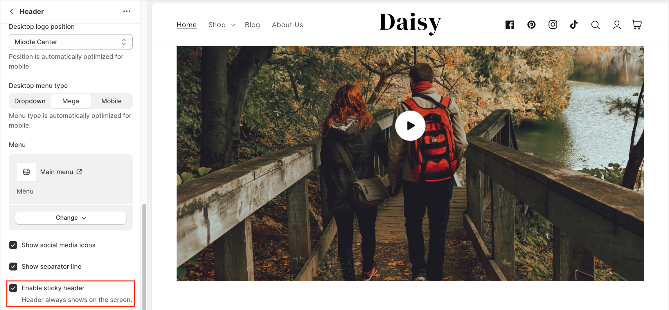 Check the box Enable sticky header: Using a sticky header on your store offers several advantages that can enhance the user experience, improve navigation, and potentially increase conversions. A sticky header refers to a navigation menu or header that remains fixed at the top of the webpage even as the user scrolls down.