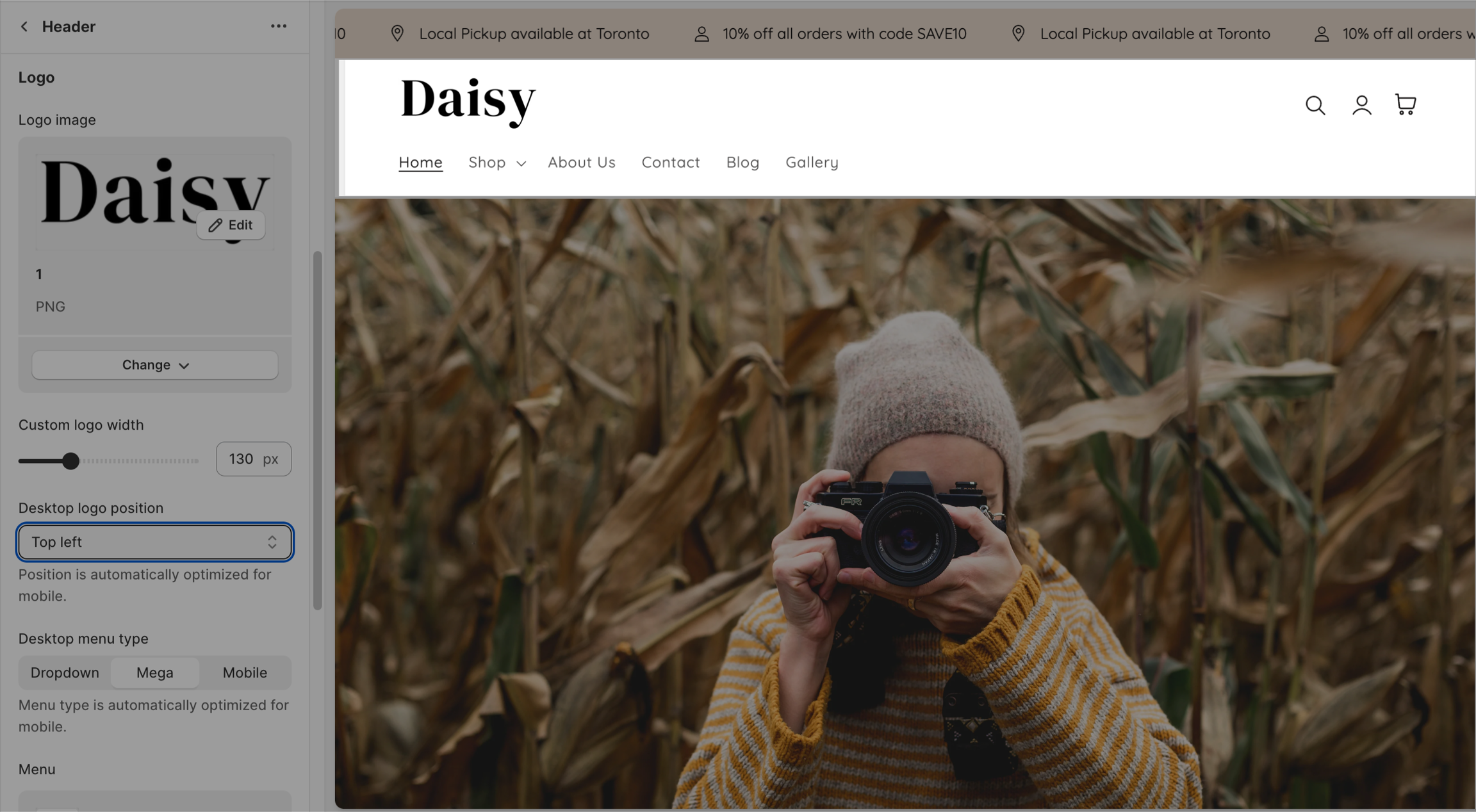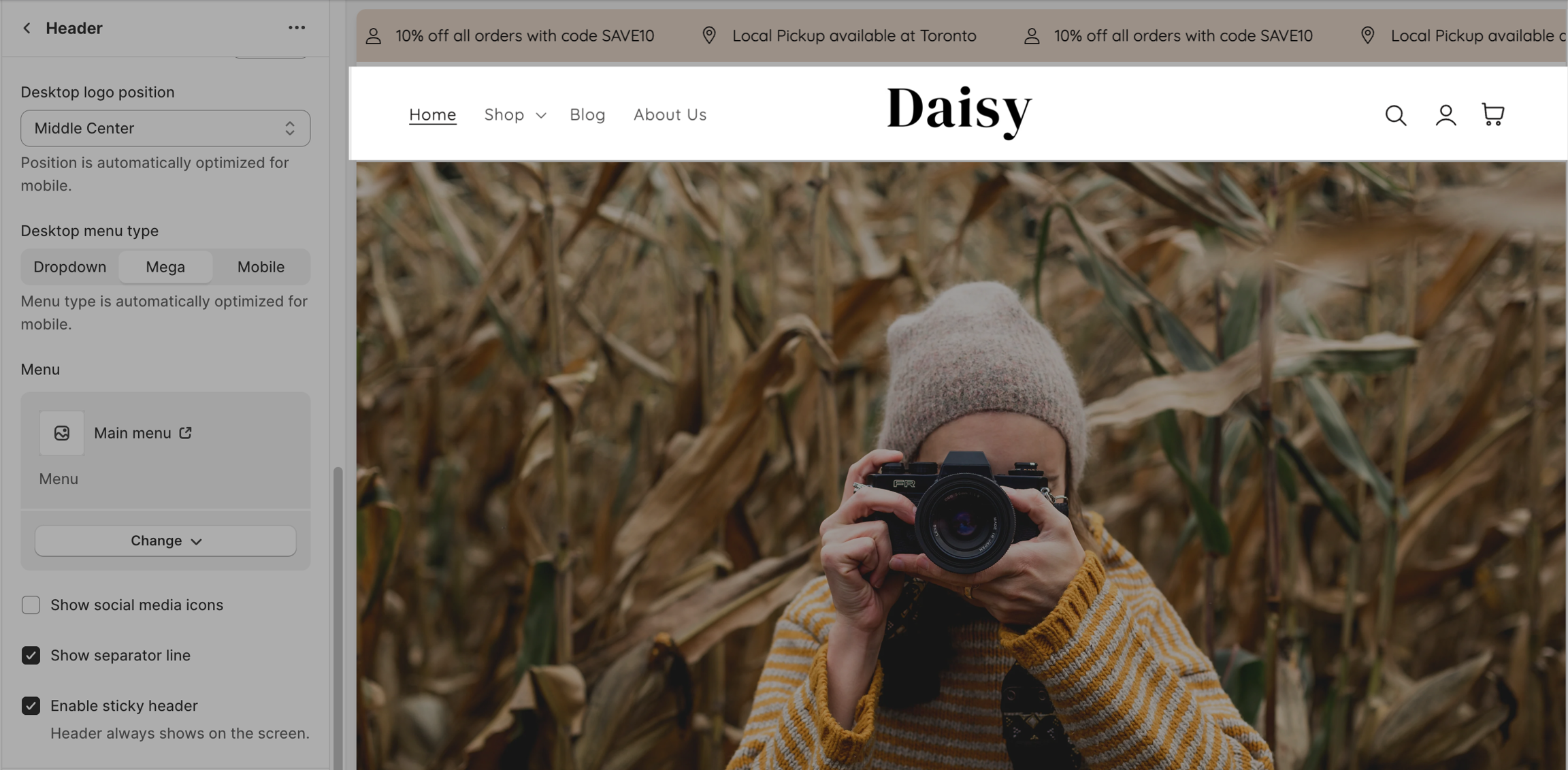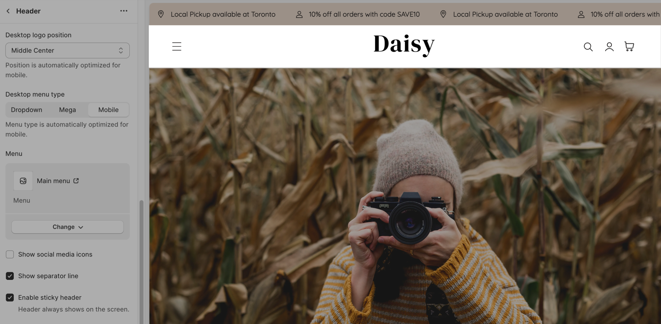 Desktop menu type: This setting helps you customize the display of the header menu.
