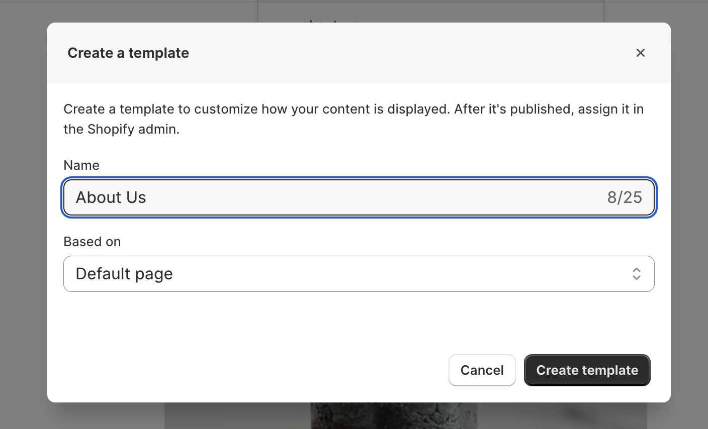 After creating a page template, return to the Shopify admin and assign your page to the newly created template to the page.