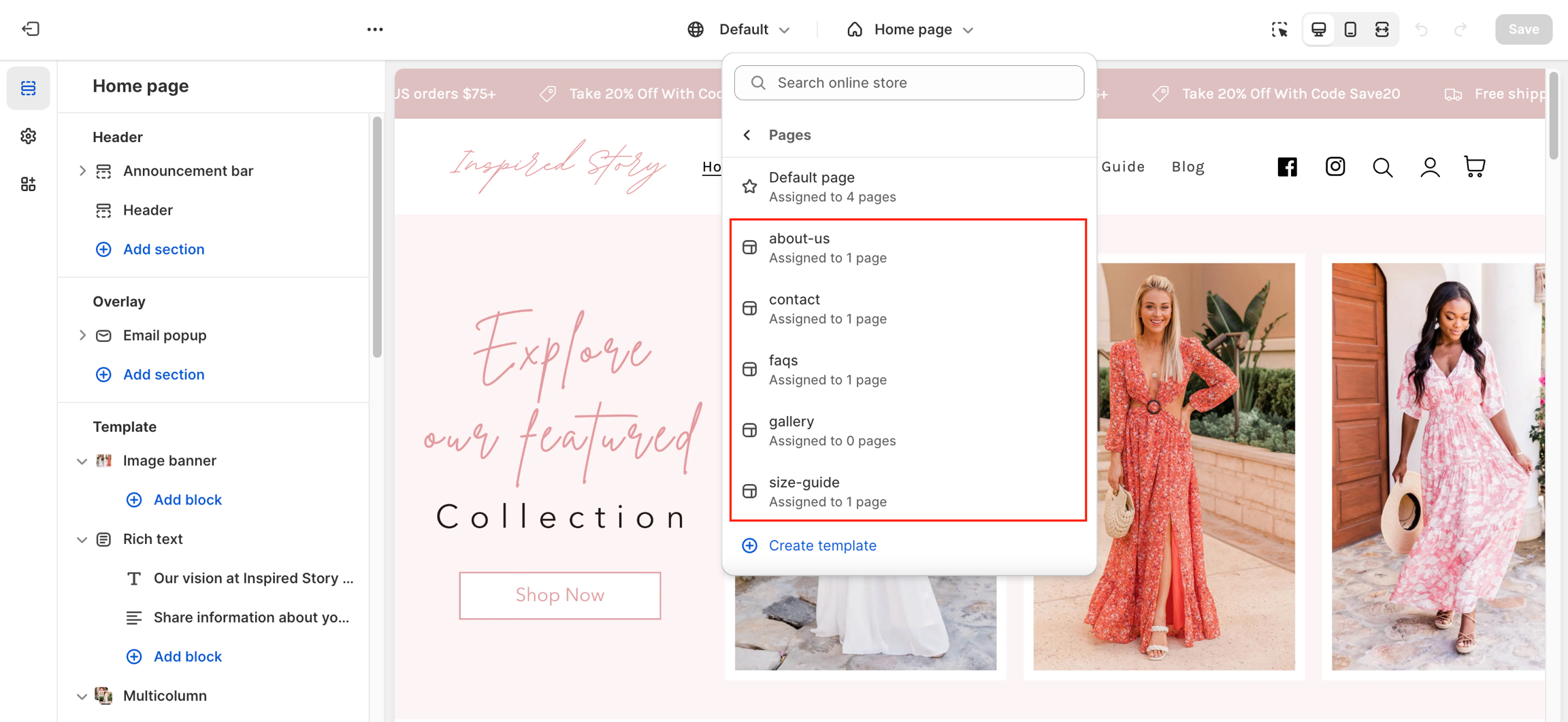 Note: Page templates cannot be assigned on unpublished or trial themes. All changes to your templates will be saved but can only be assigned when published and purchased.