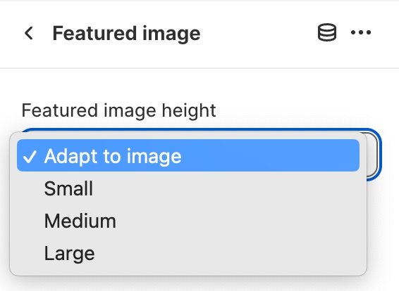 Click on the Featured image block to open its settings: Select an option to crop your image to Small, Medium, or Large. The Adapt to image setting will display the original orientation of your image.