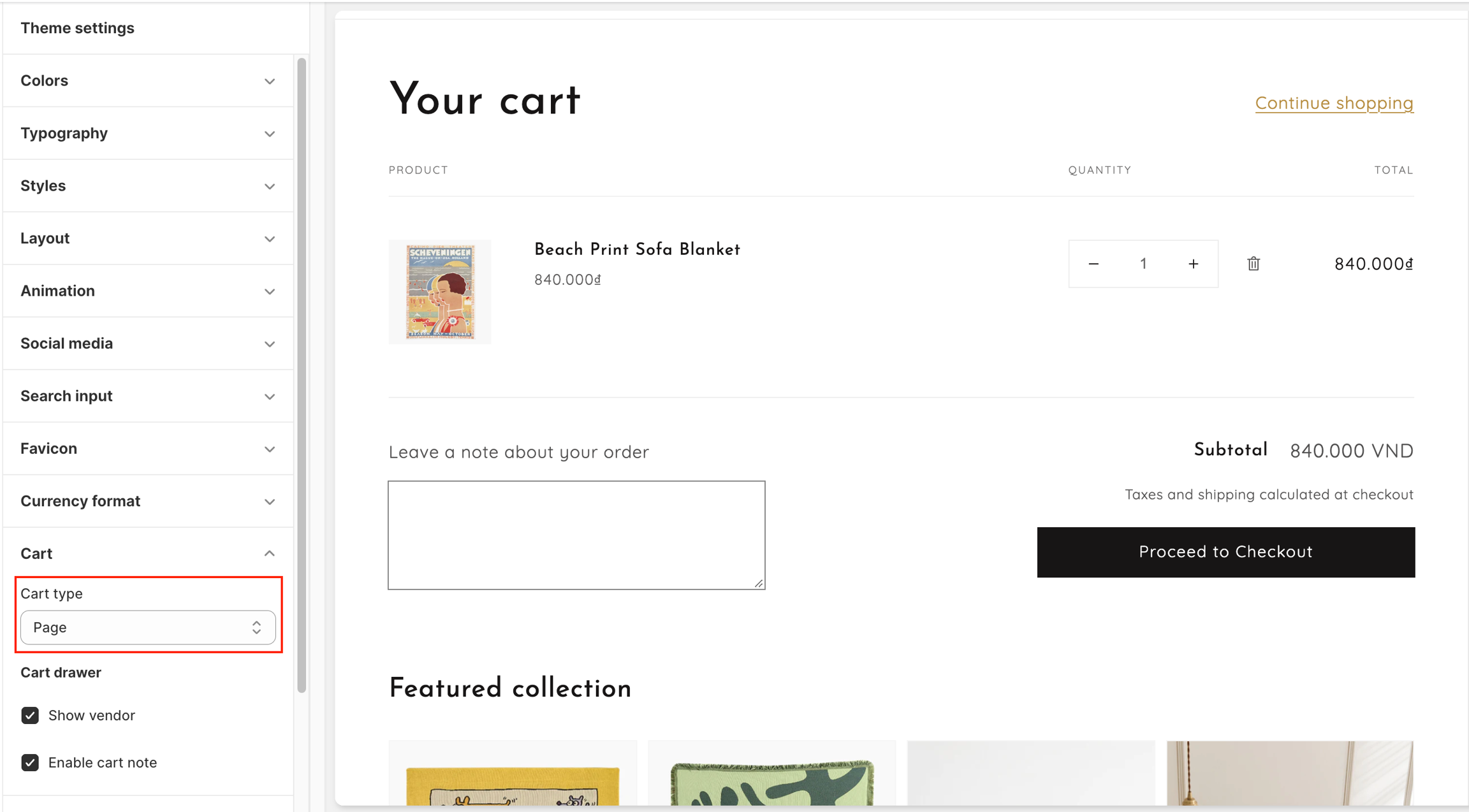 Click the Cart page section to open the settings. You can add and edit theme sections (link article: Sections) to customize the layout of your page.
