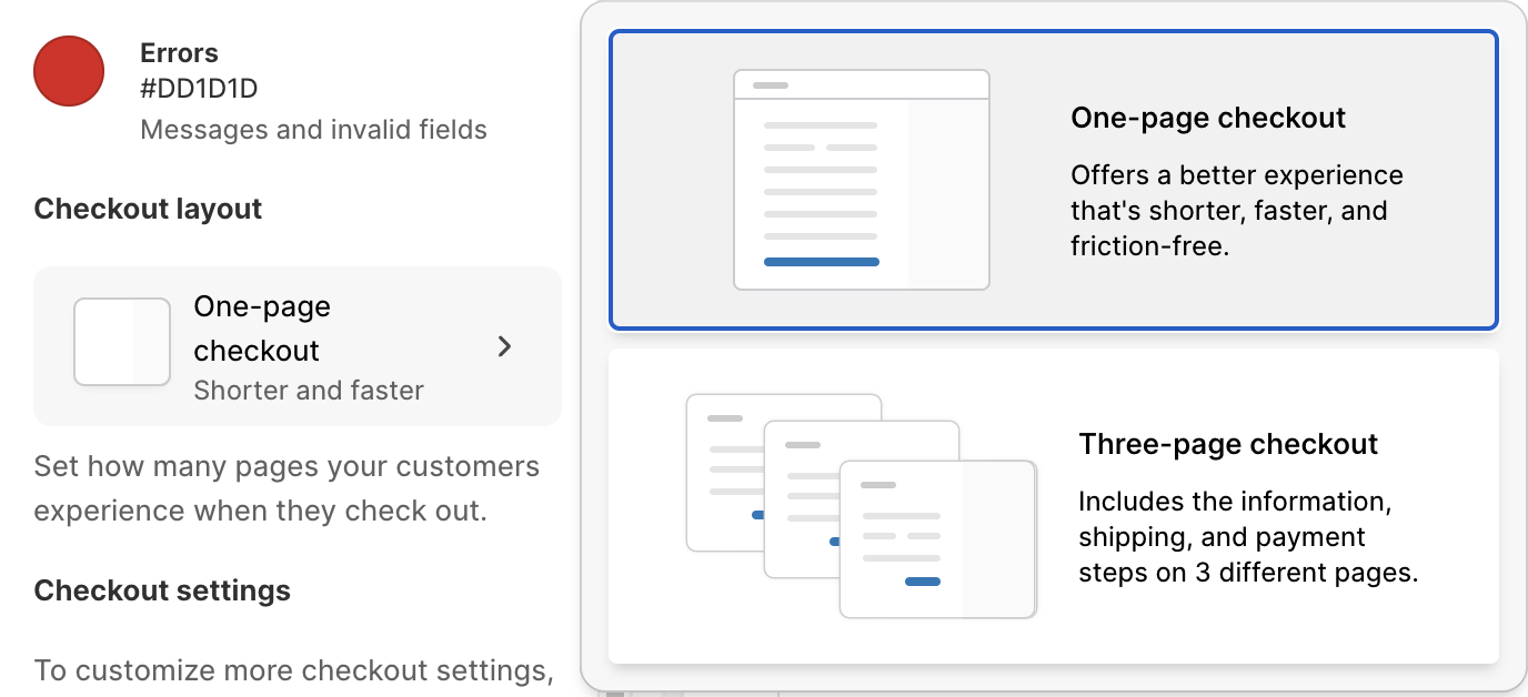 * **Checkout layout**: Select **One-page checkout** or **Three-page checkout** to set the checkout layout.
