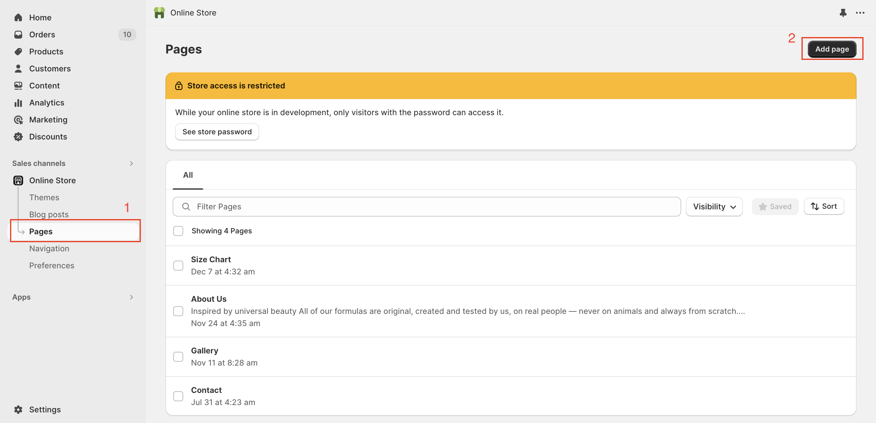 * From your Shopify admin, go to **Online Store** > **Pages**.