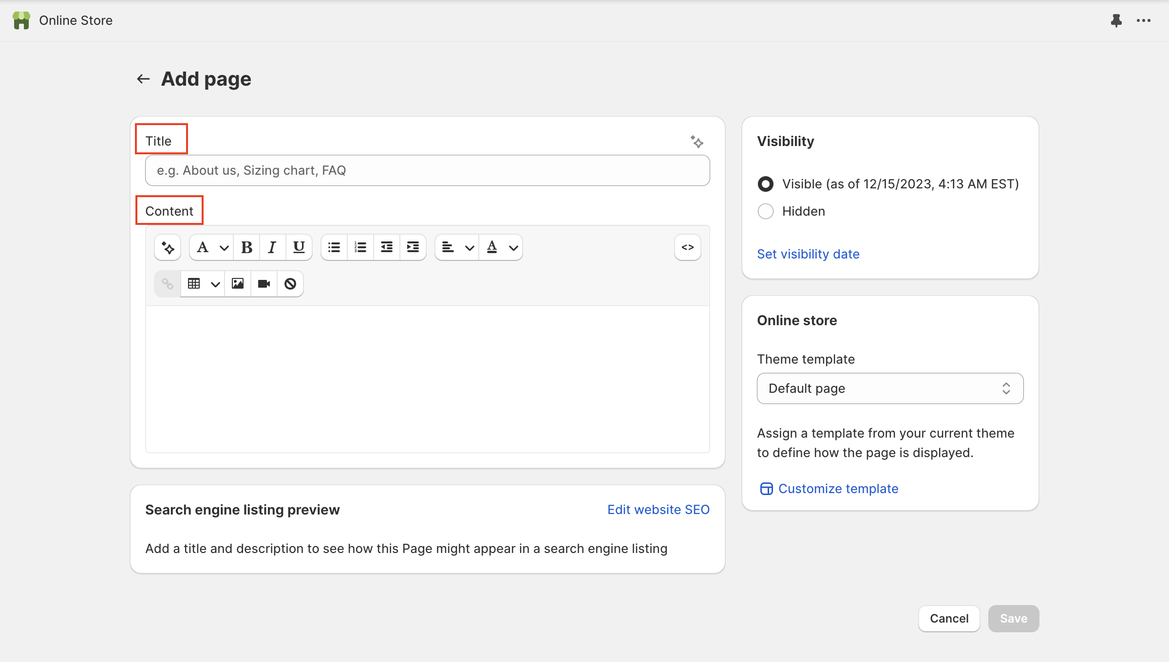 * Enter a **title** and **content** for the page. Be descriptive and clear when choosing your page title. Your page title is displayed in the tab or title bar of browsers, and also in search engine results.