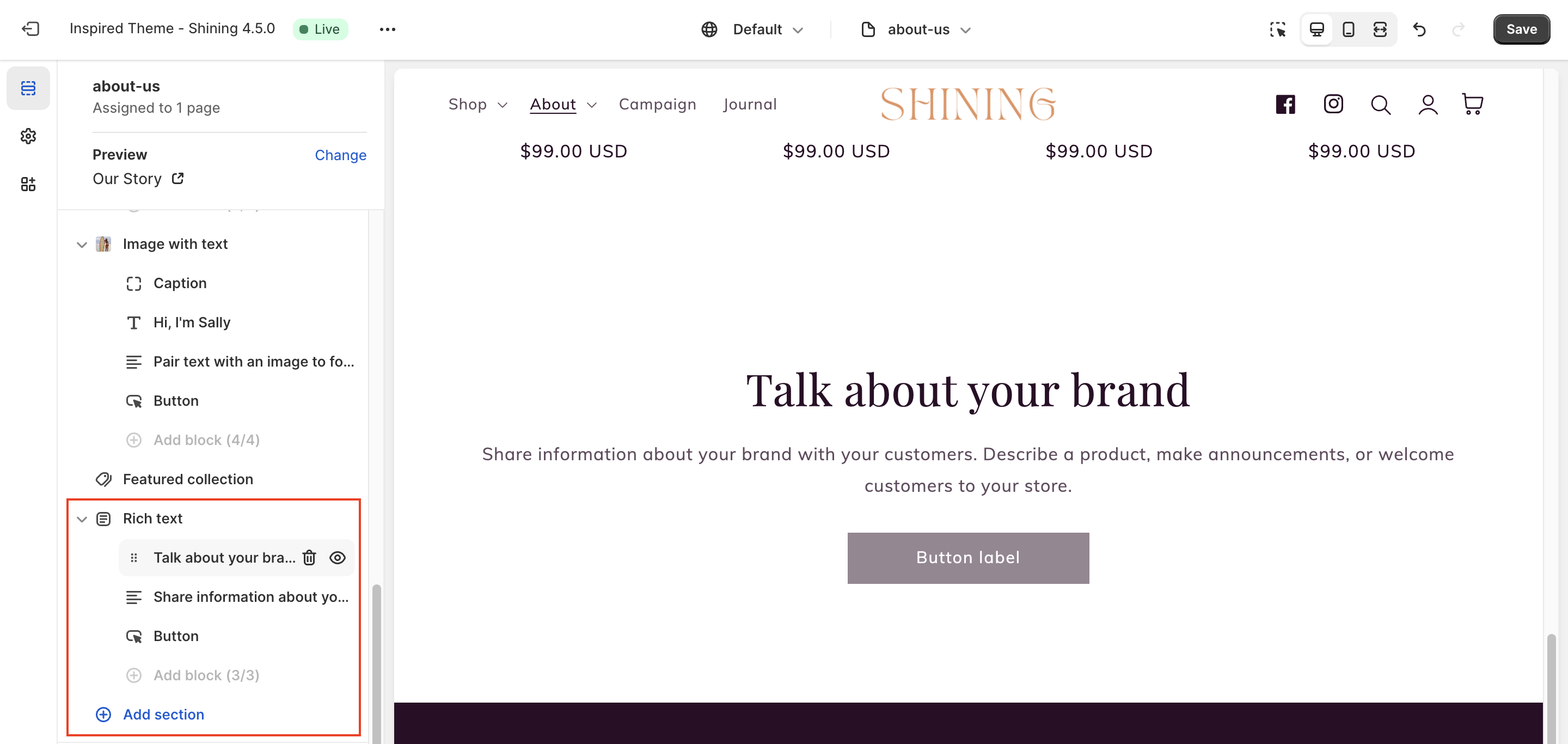 * Click **Save**. Visit the page in your online store to make sure the changes appear. You might have to reload the browser to view saved changes.