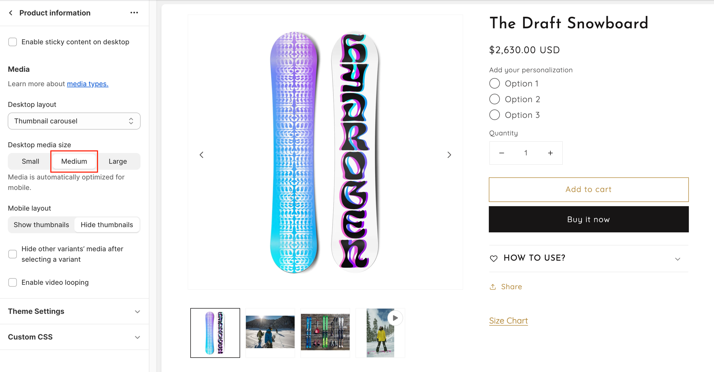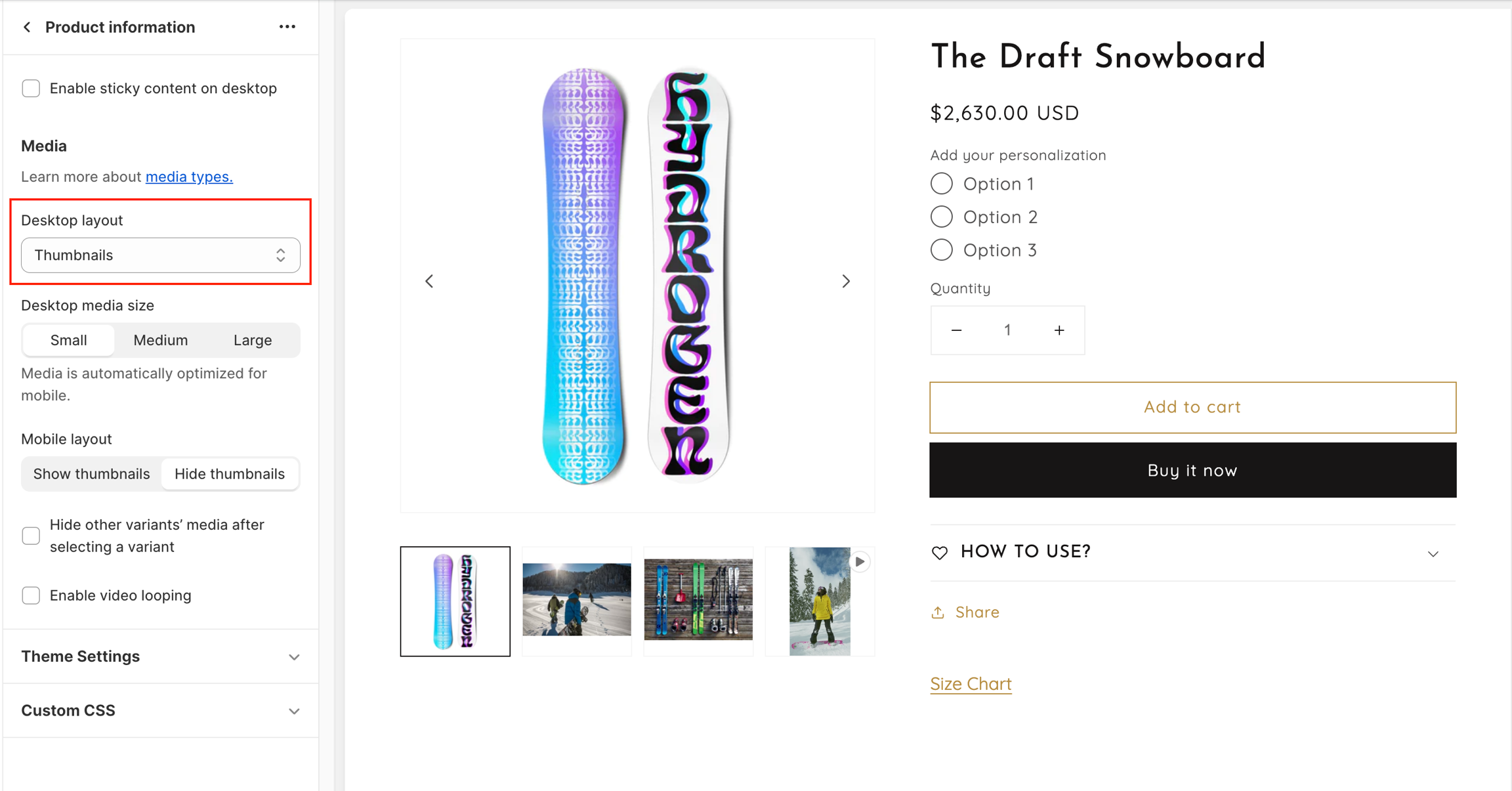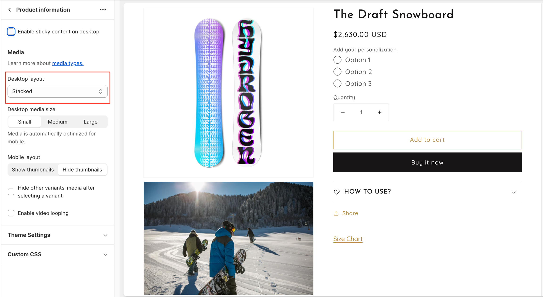 3. Customize the media layout in your product information section with options for desktop and mobile: