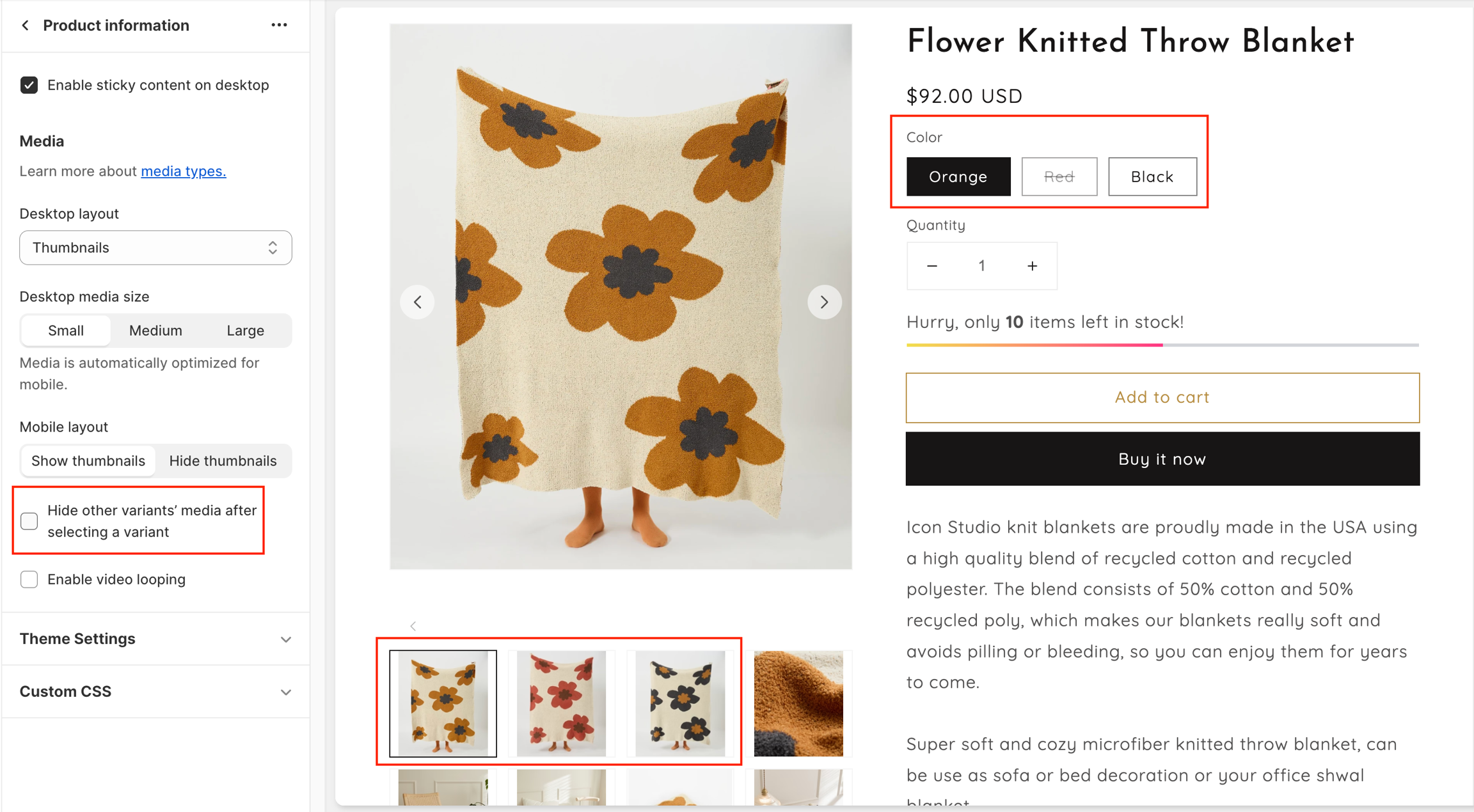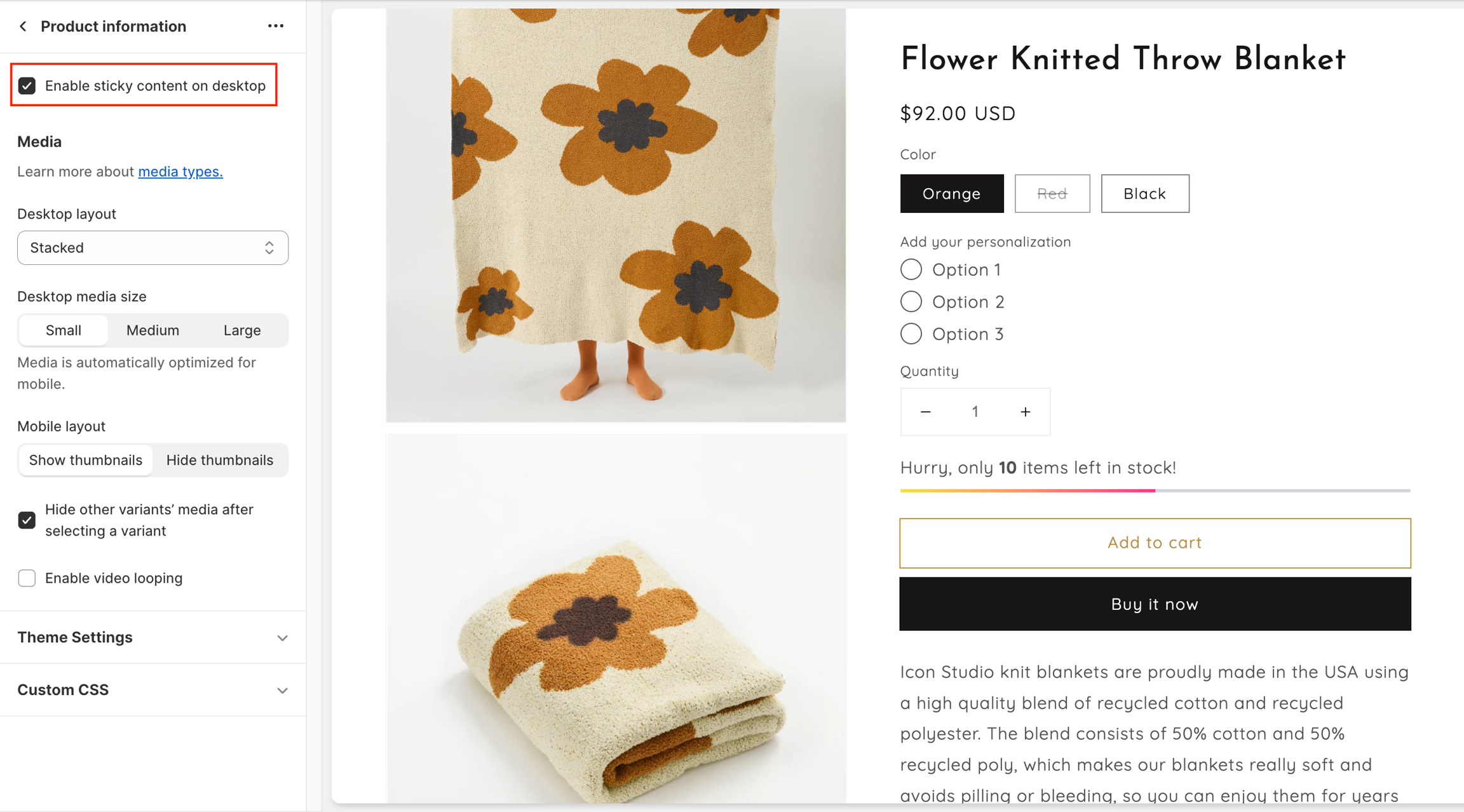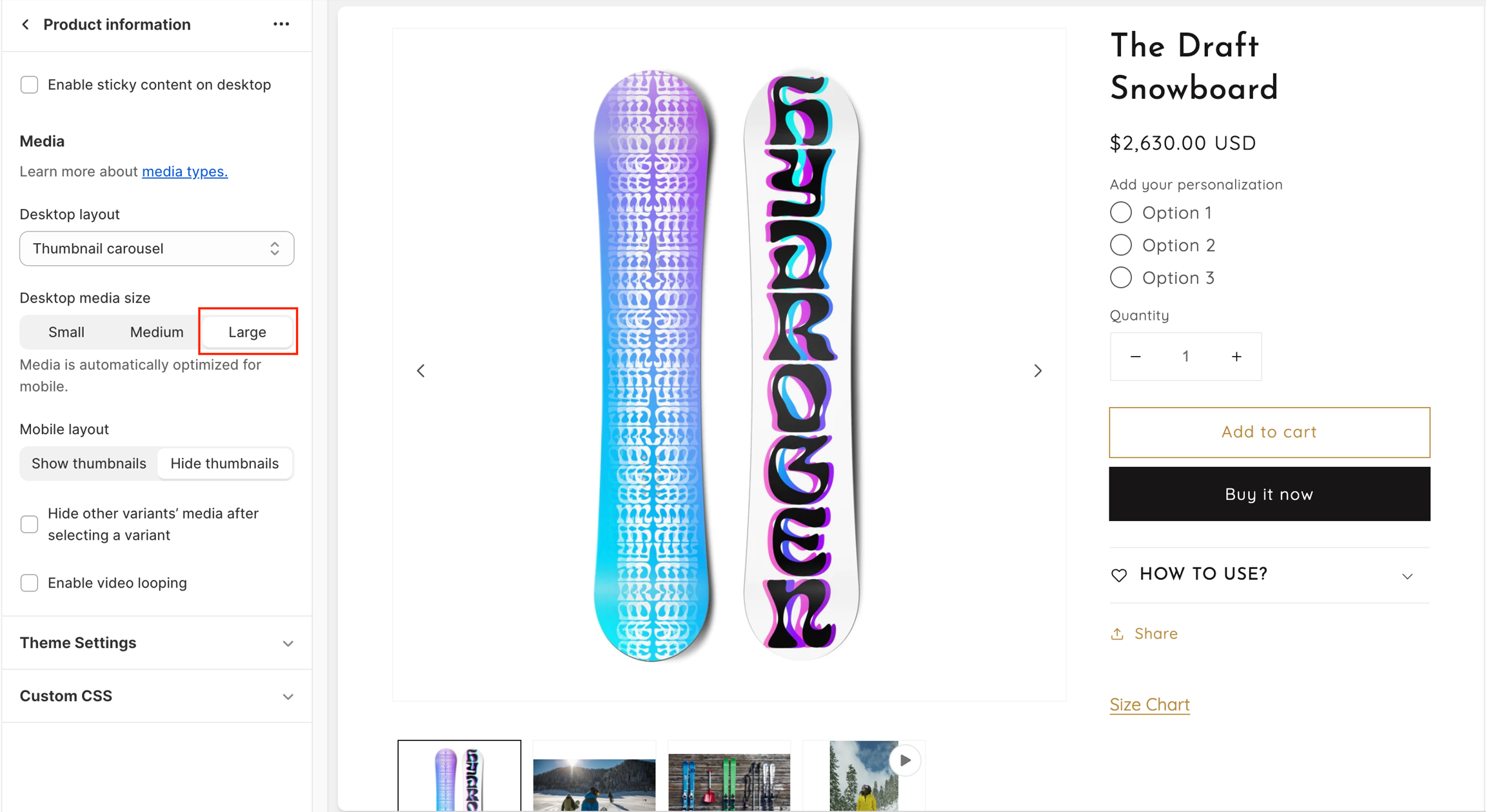 3. Customize the media layout in your product information section with options for desktop and mobile: