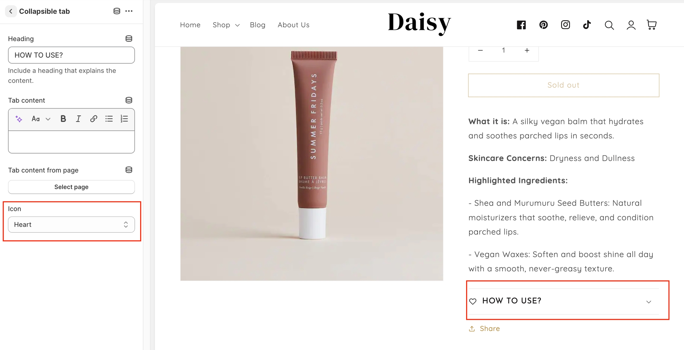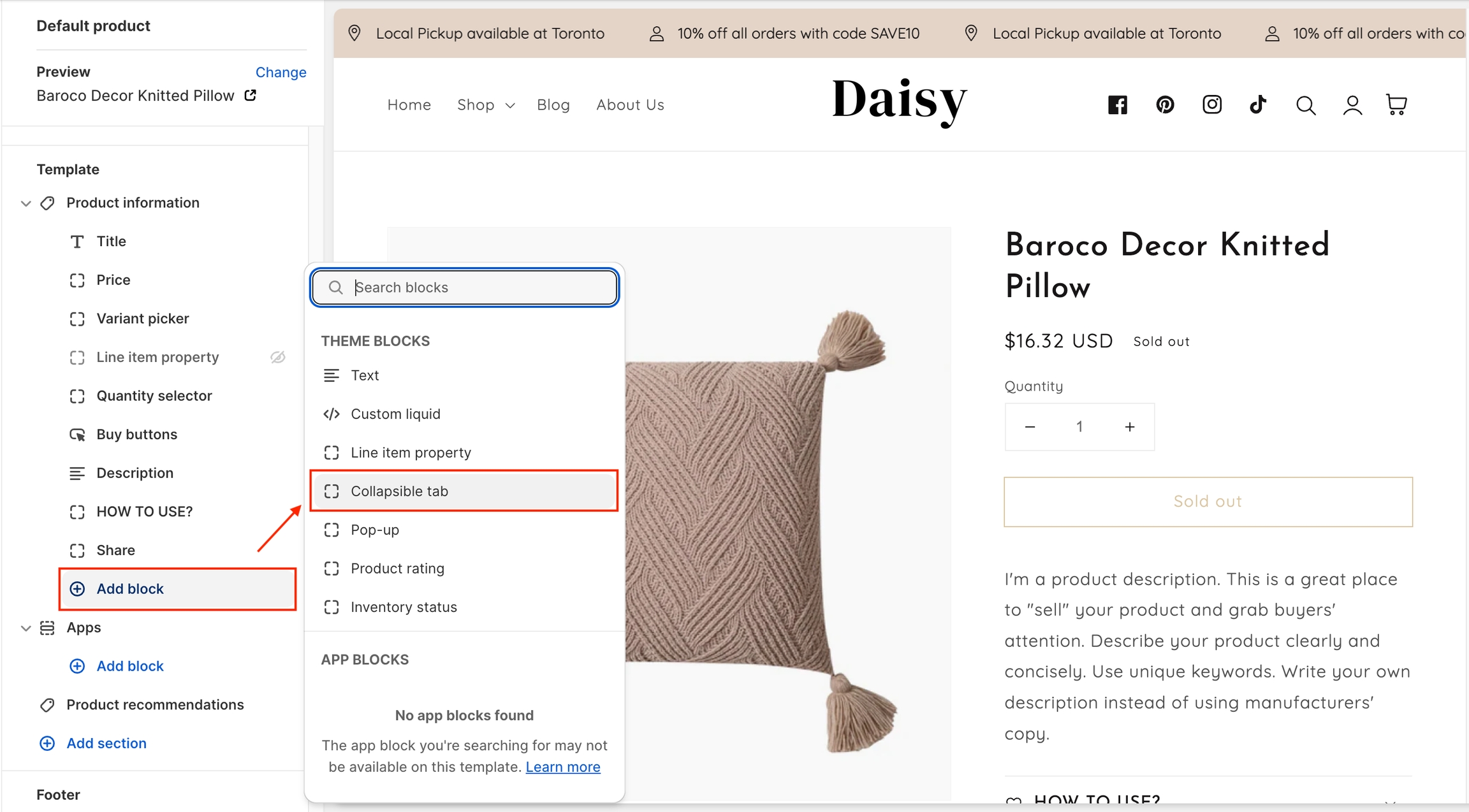 You can add an answer to common questions or compactly add further product details with a Collapsible tab block.