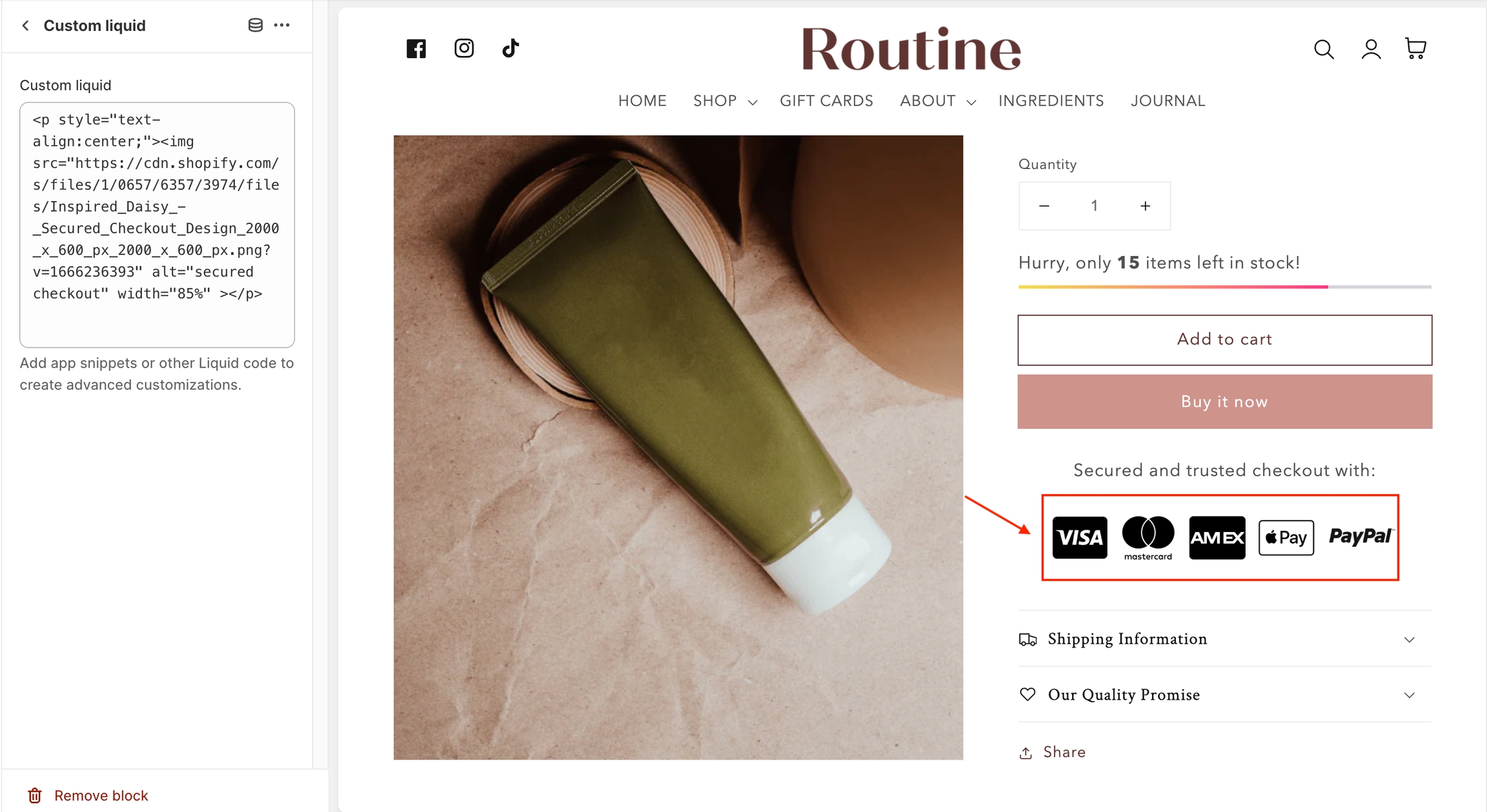 Click on the Custom liquid block, the settings sidebar will open and you can configure the option below: