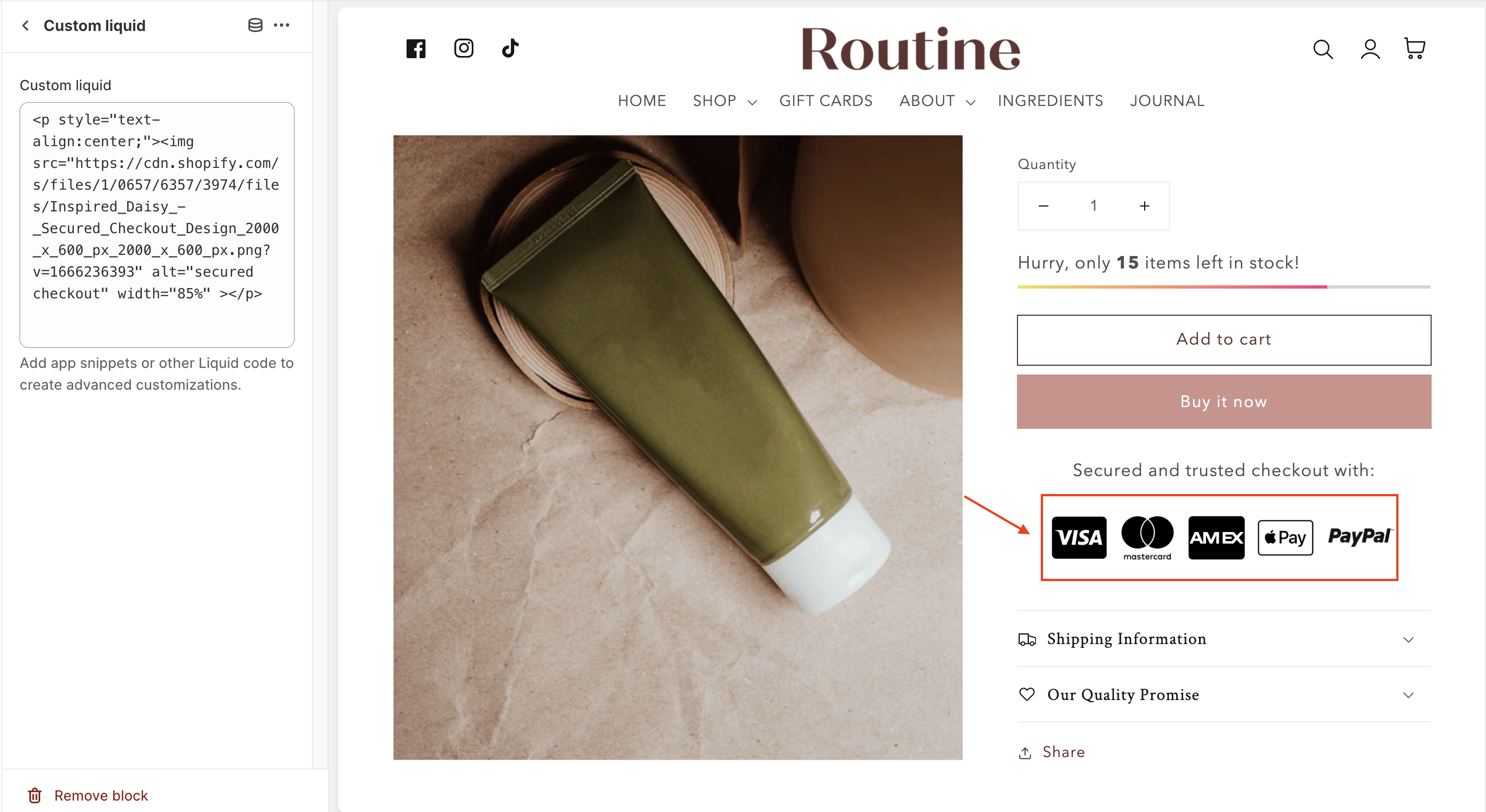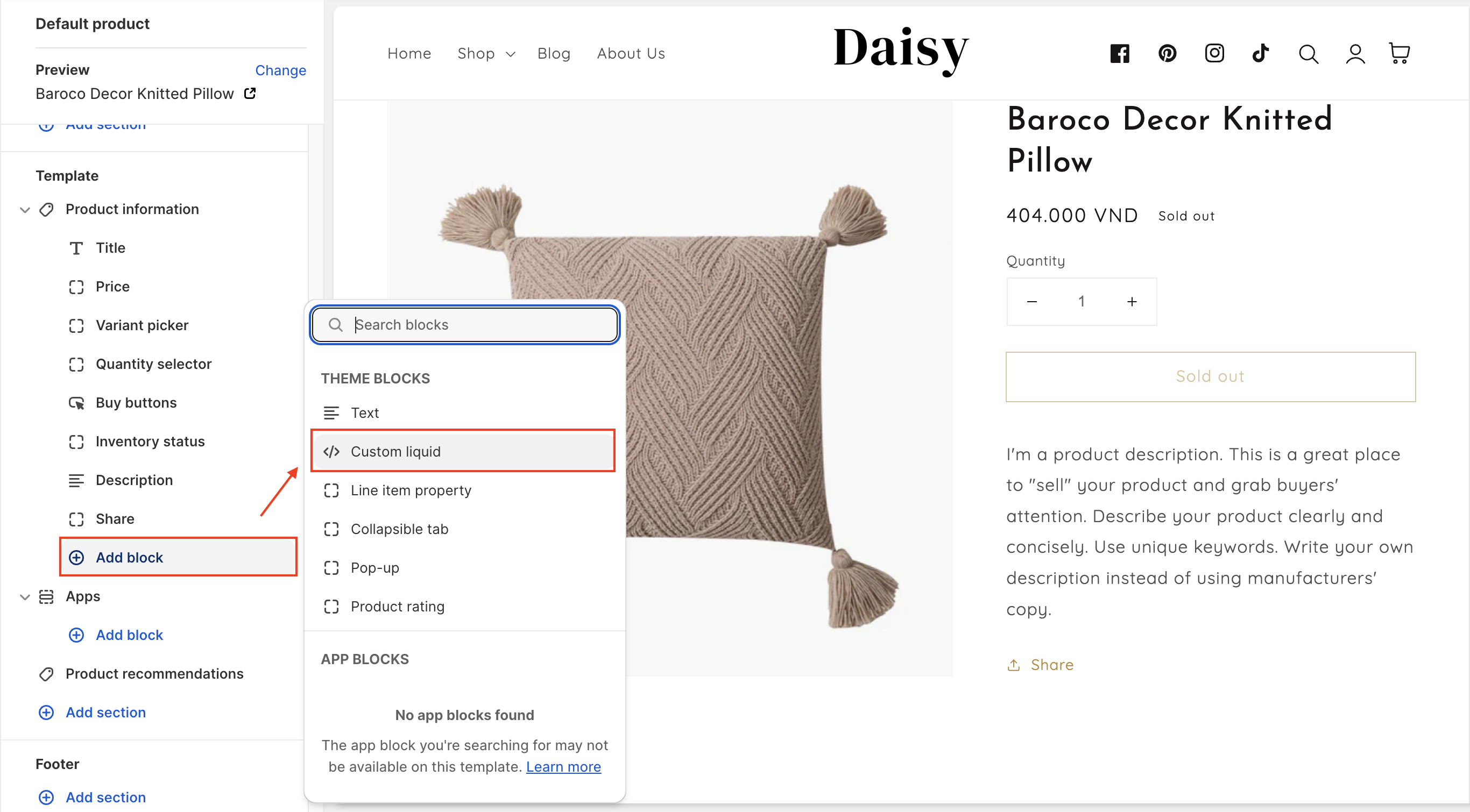 * **Custom liquid** box will allow you to add liquid code for your product page. So, you can extend the information for your product page.