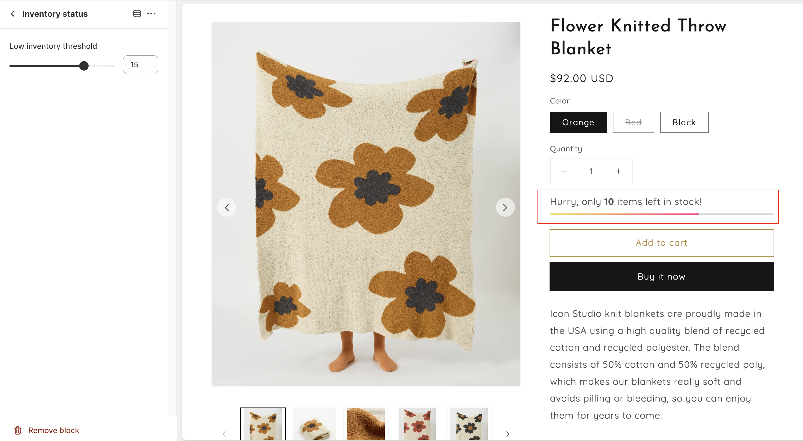 When your current product inventory matches or goes below the **Low inventory threshold**, the indicator bar will display a "Limited quantities available" message about the **number of products left in stock** and a **status line**!