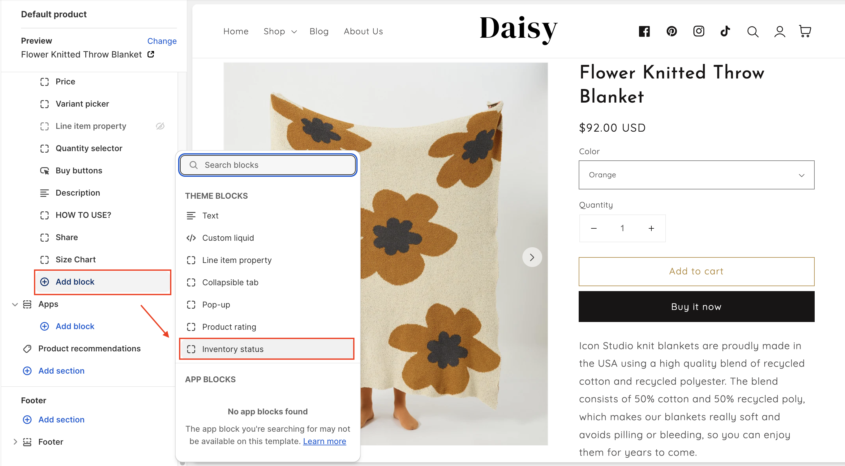> ***Note:** Before adding an **Inventory status** block, you need to enable the **Track quantity** option for your product and product variants.*