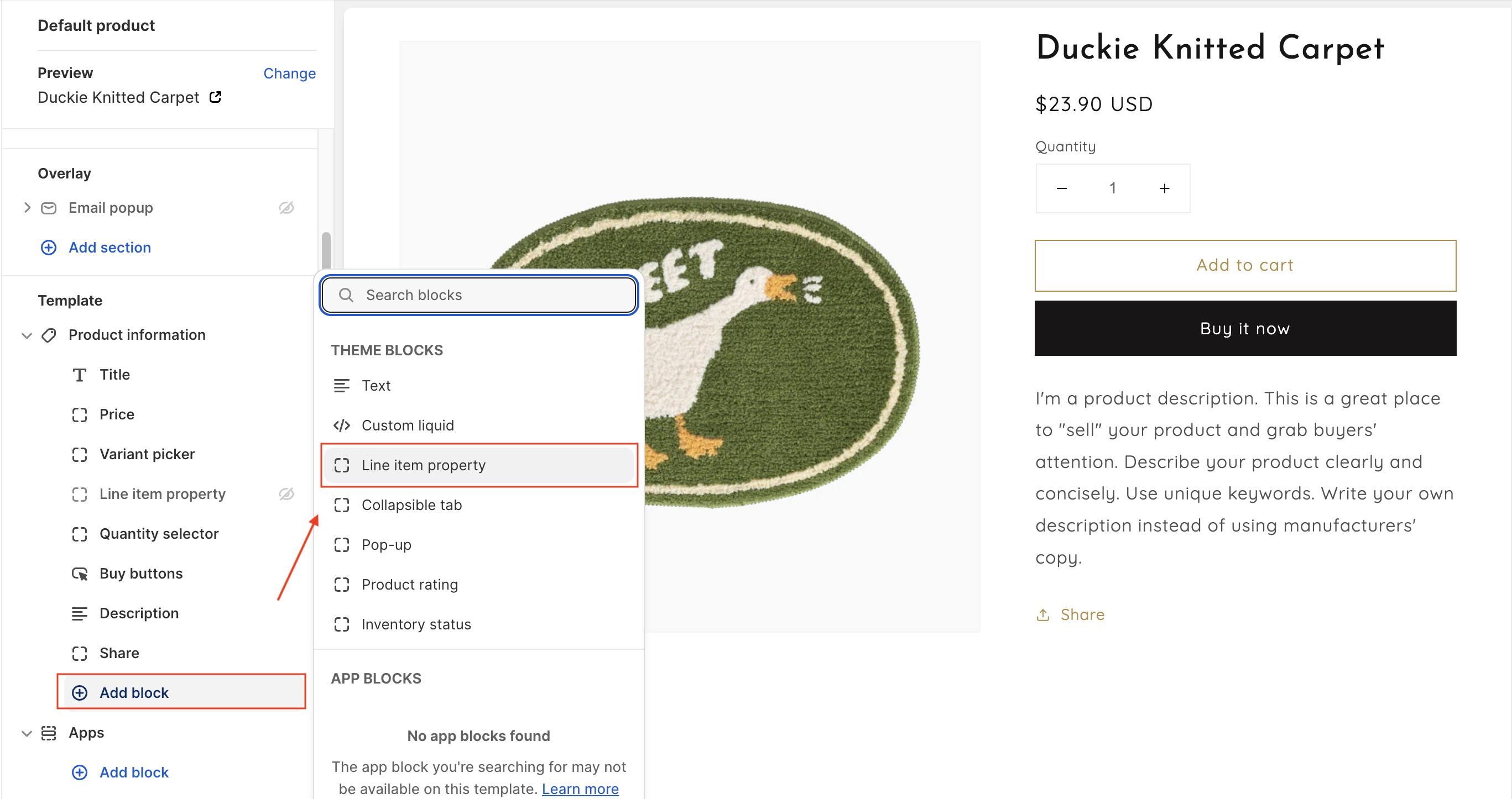 * In the theme editor, under the Product information section, click **Add block.**
