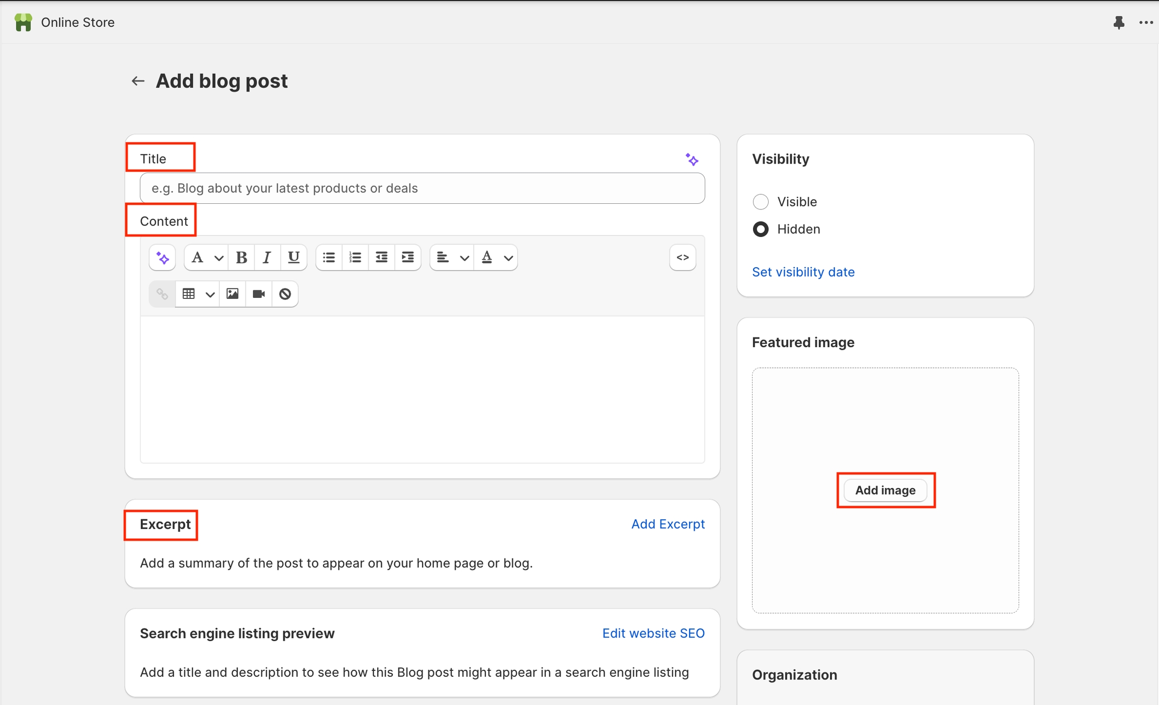 From your Shopify admin, go to Online Store > Blog posts > Add blog post