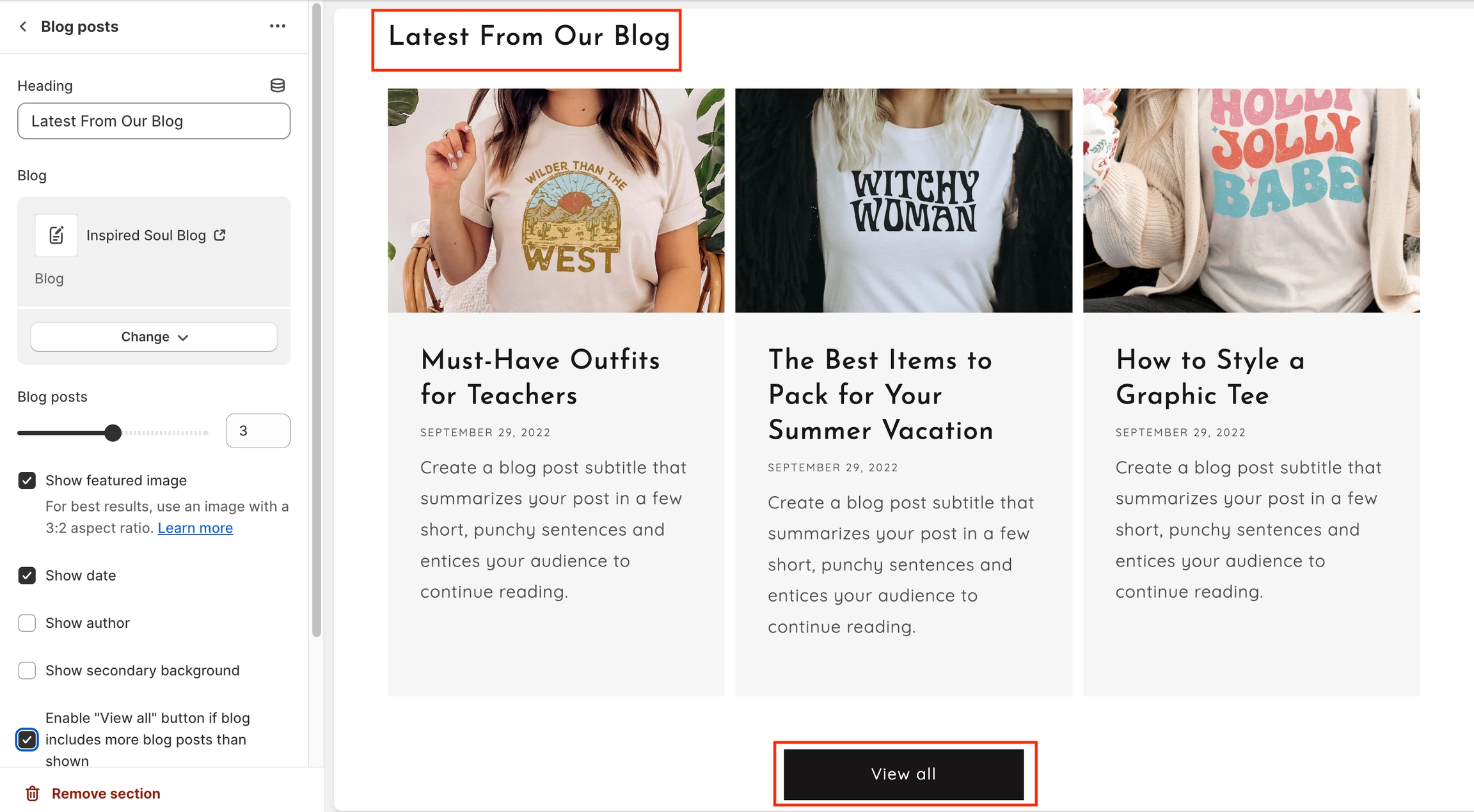 Add a heading (enter text to display a section title in the top-left corner) and Enable "View all" button if the blog includes more blog posts than shown.