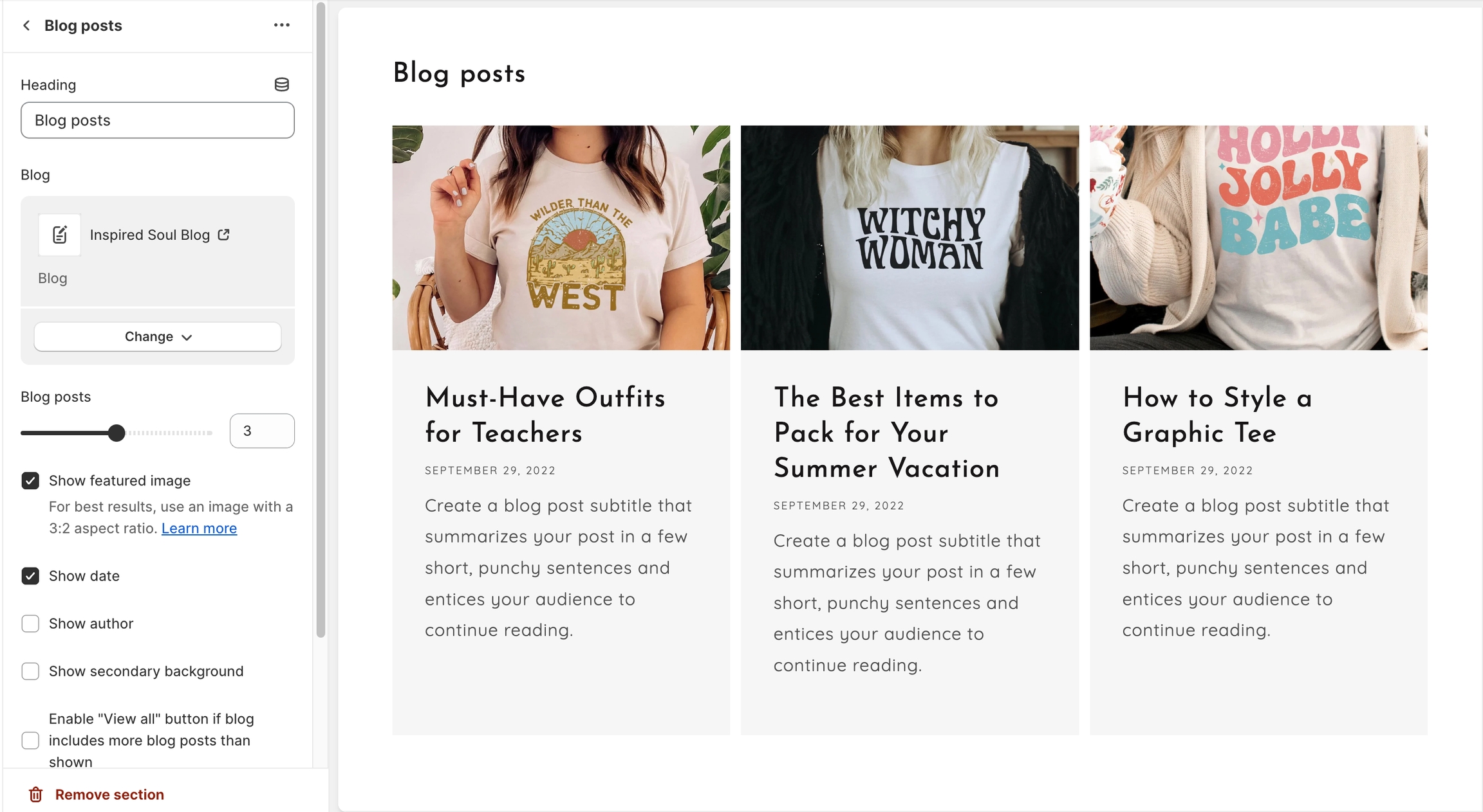 Click on the Blog posts section to open the section settings.