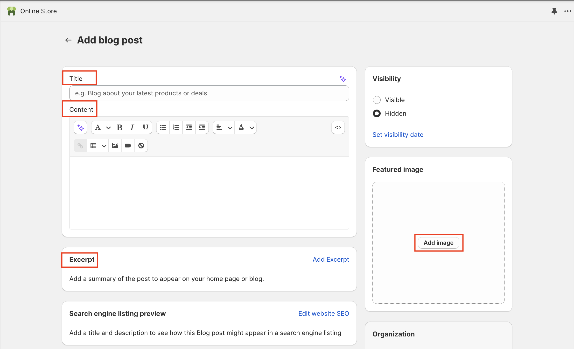 * From your **Shopify admin**, go to **Online Store** **>** **Blog posts > Add blog post**