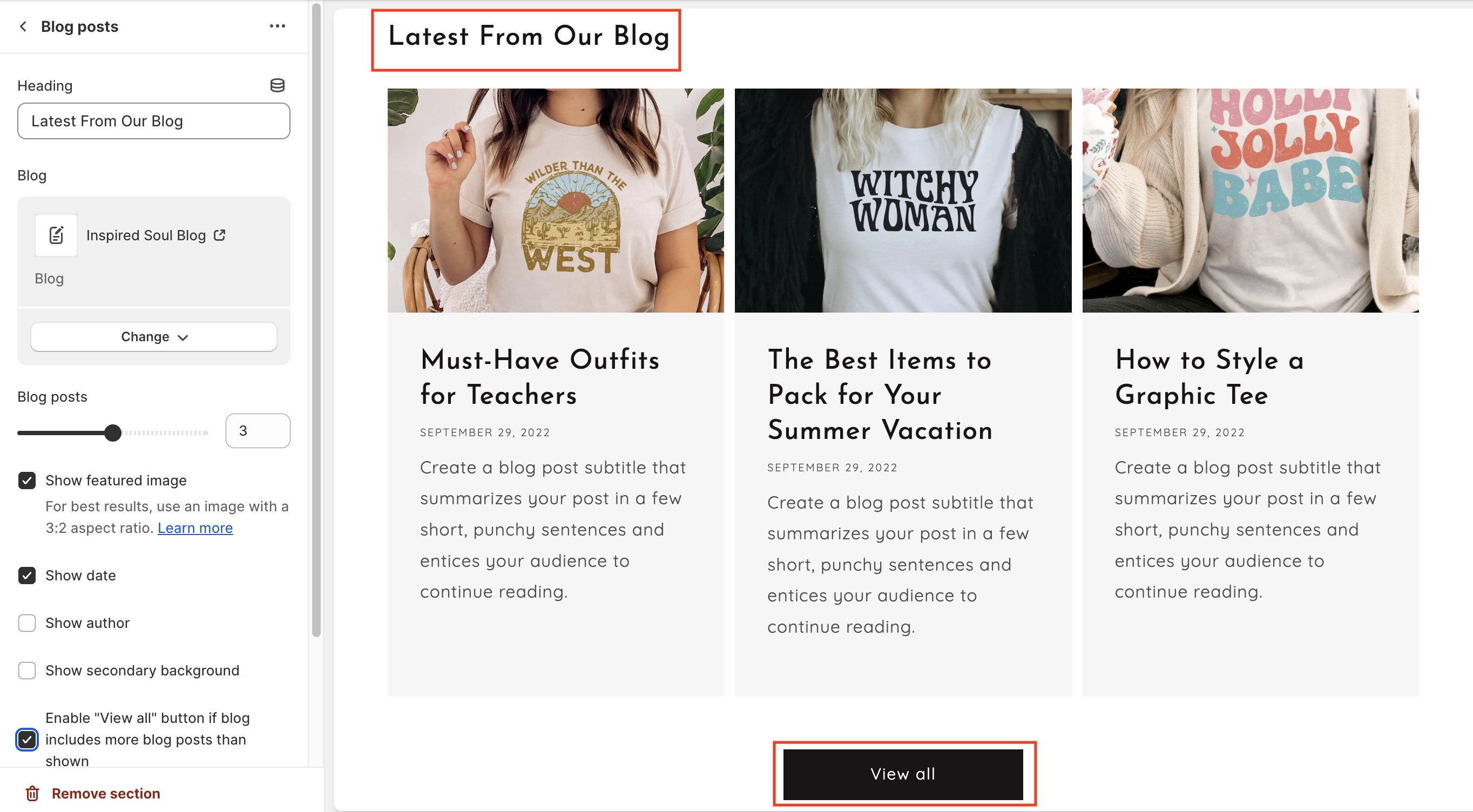 * Add a **heading** (enter text to display a section title in the top-left corner) and Enable "**View all**" button if the blog includes more blog posts than shown.