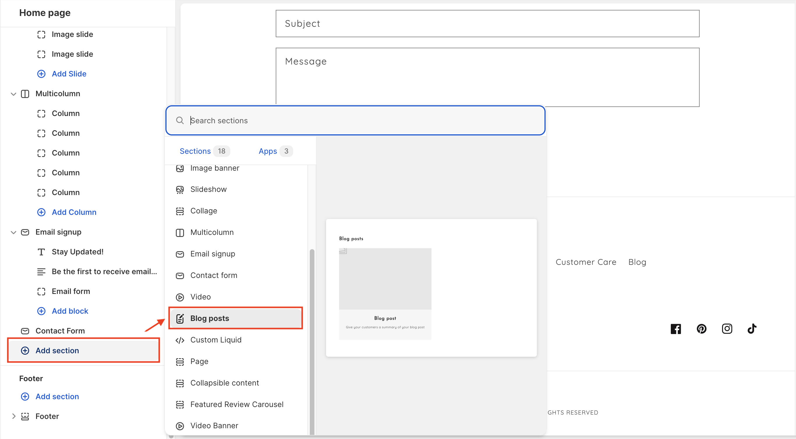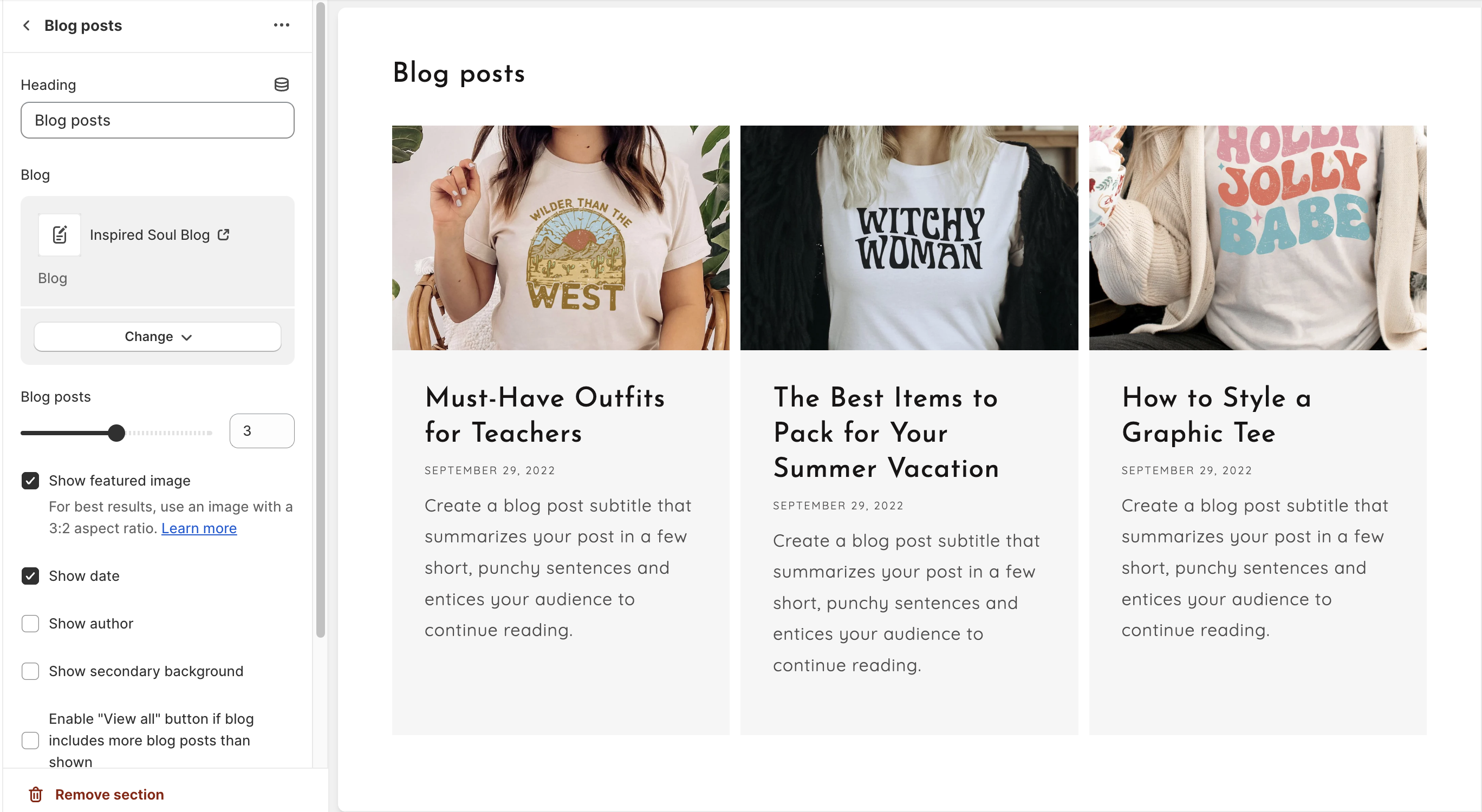 * Click on the **Blog posts** section to open the section settings.