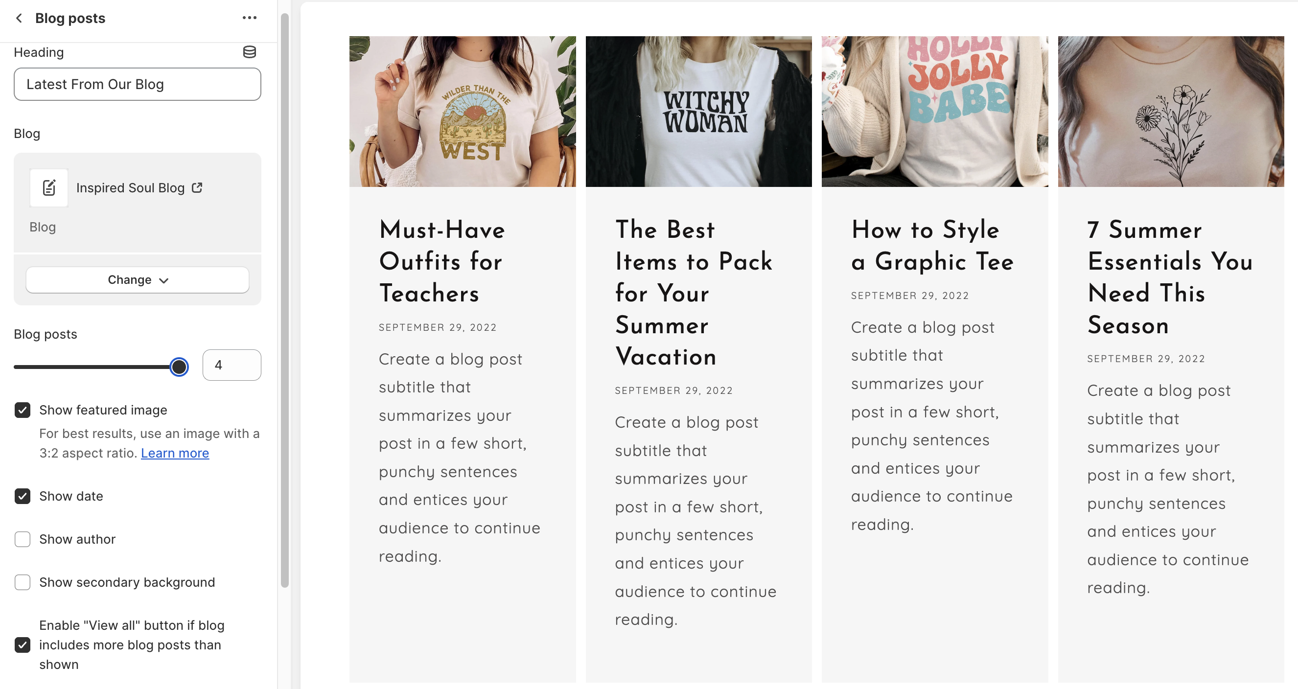* Show **Secondary** **background**, the **number** **of blog posts** (between 2 and 4), and the **featured image** of your blog.