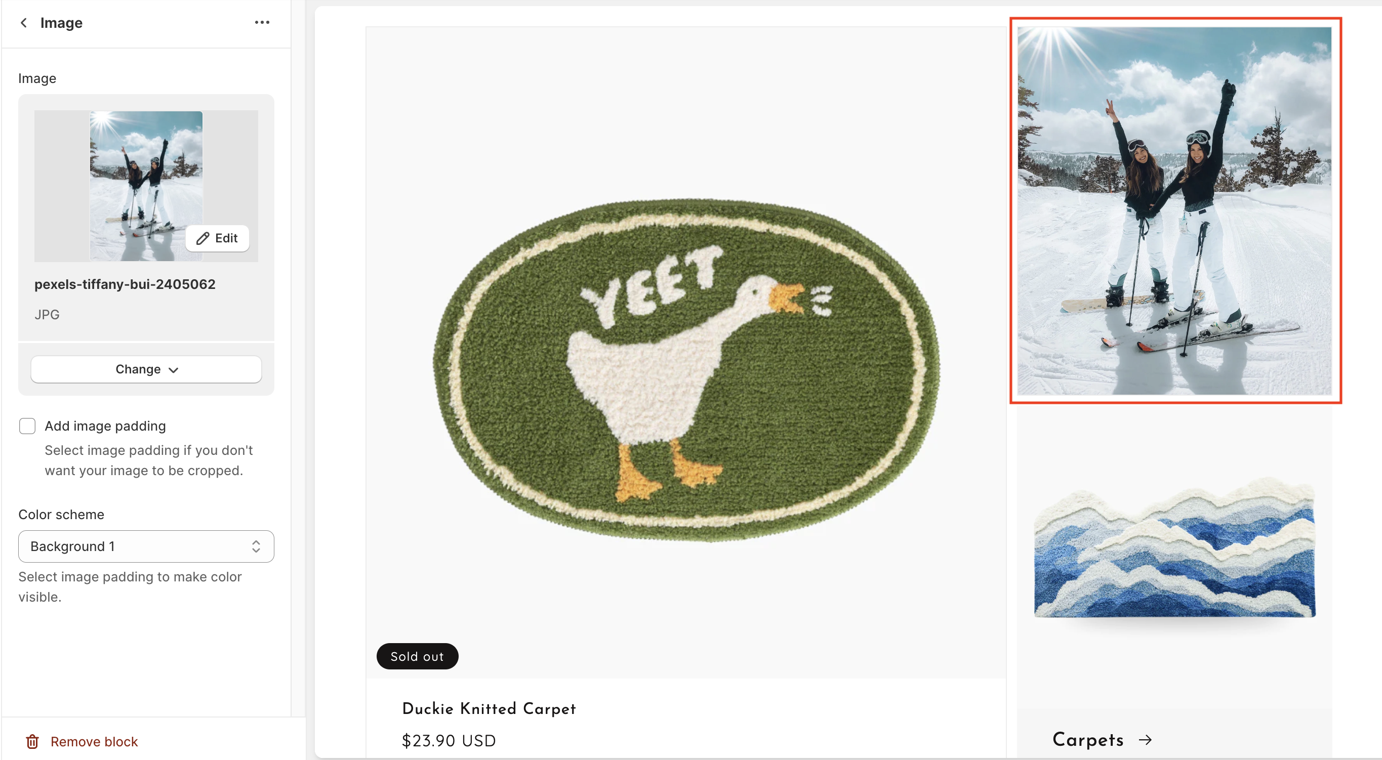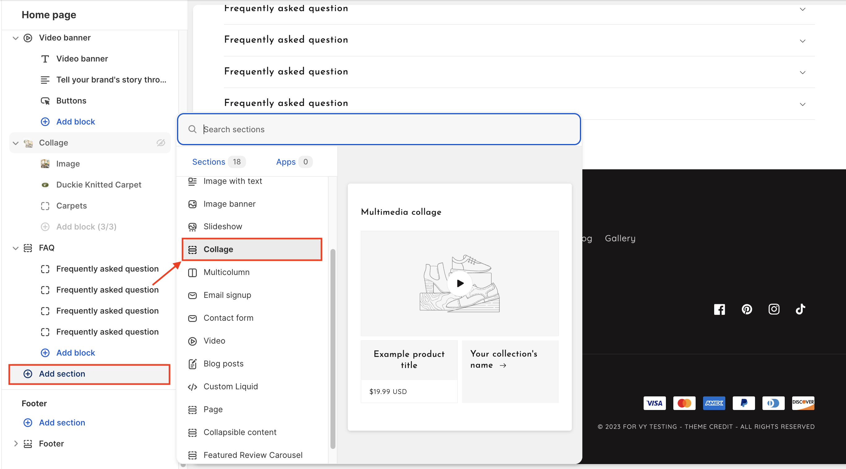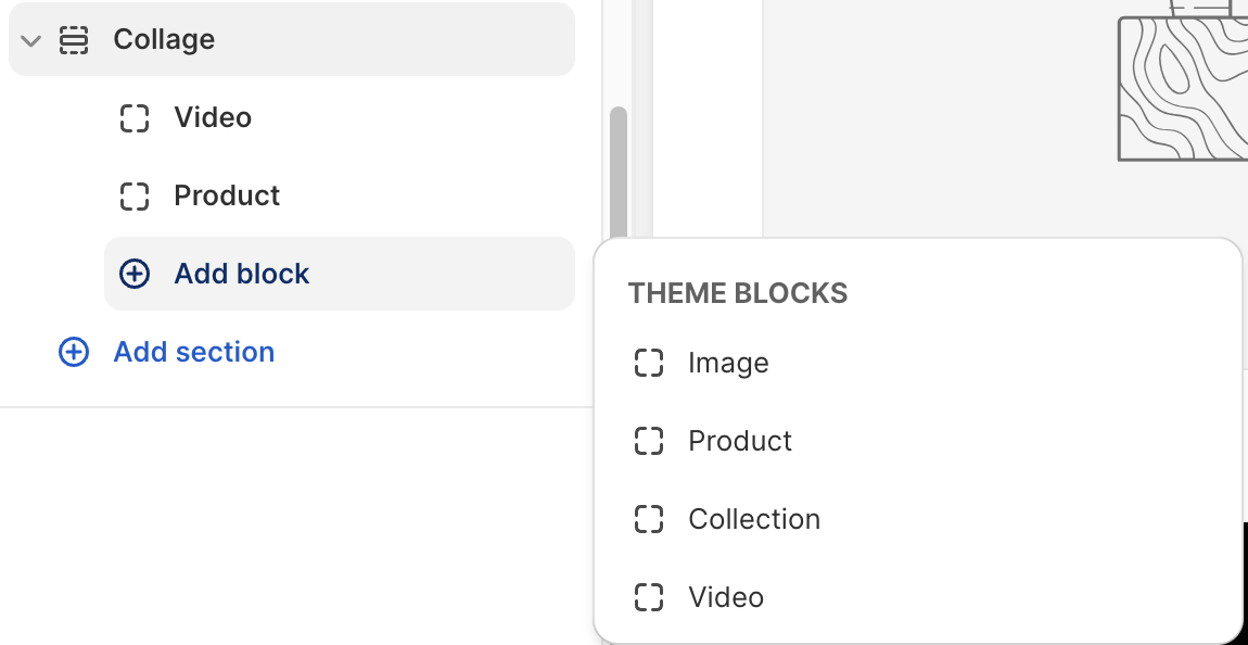 Each College section contains three blocks. By default, the section contains a **video**, **product**, and **collection** block. *To create a collage of more than three blocks, add additional collage sections below the first and don't include a Heading value to the lower collage sections. The collage sections will appear to flow together as a single section.*