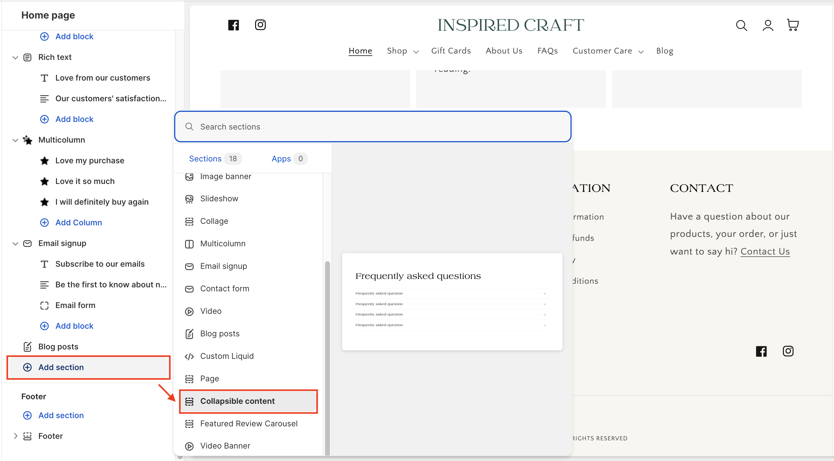 * To edit the collapsible content blocks, simply click on the collapsible content block you want to edit in your sidebar.