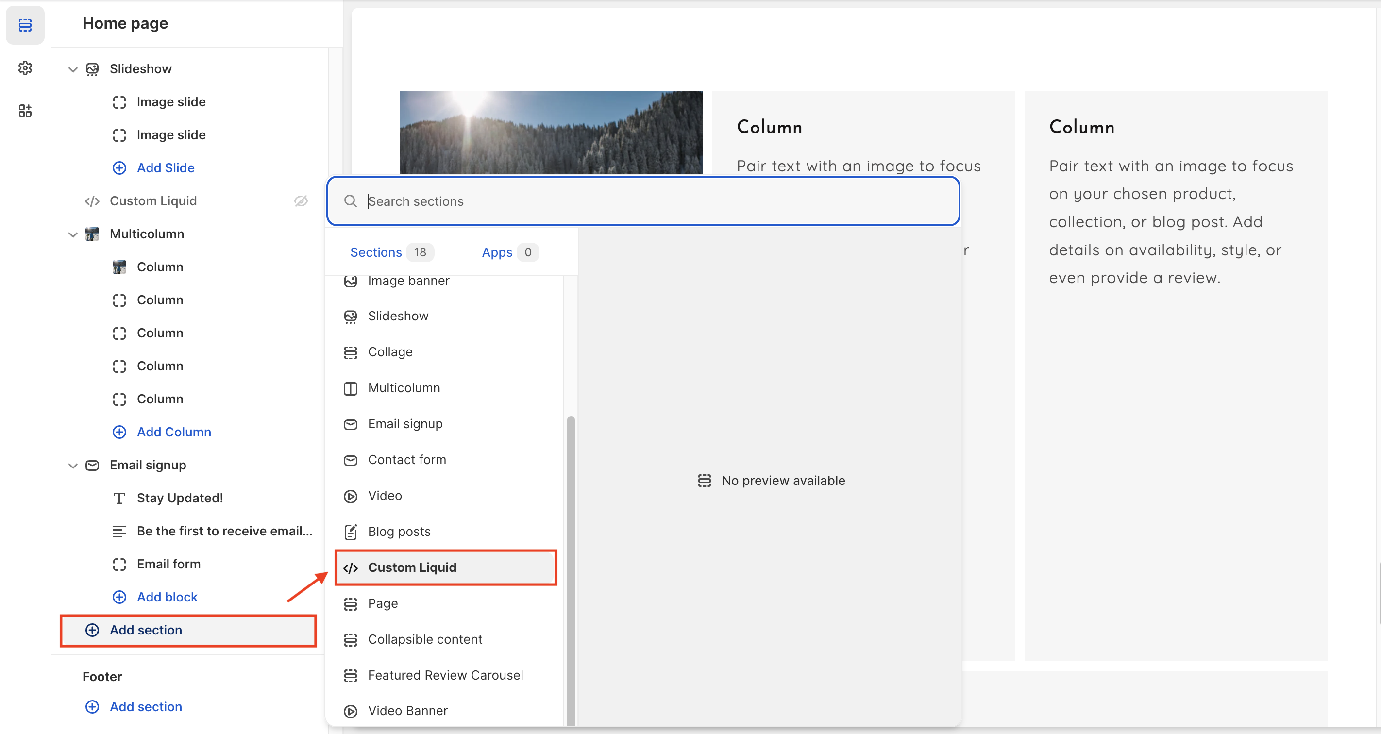 * Click on the **Custom Liquid** section to open the section settings.