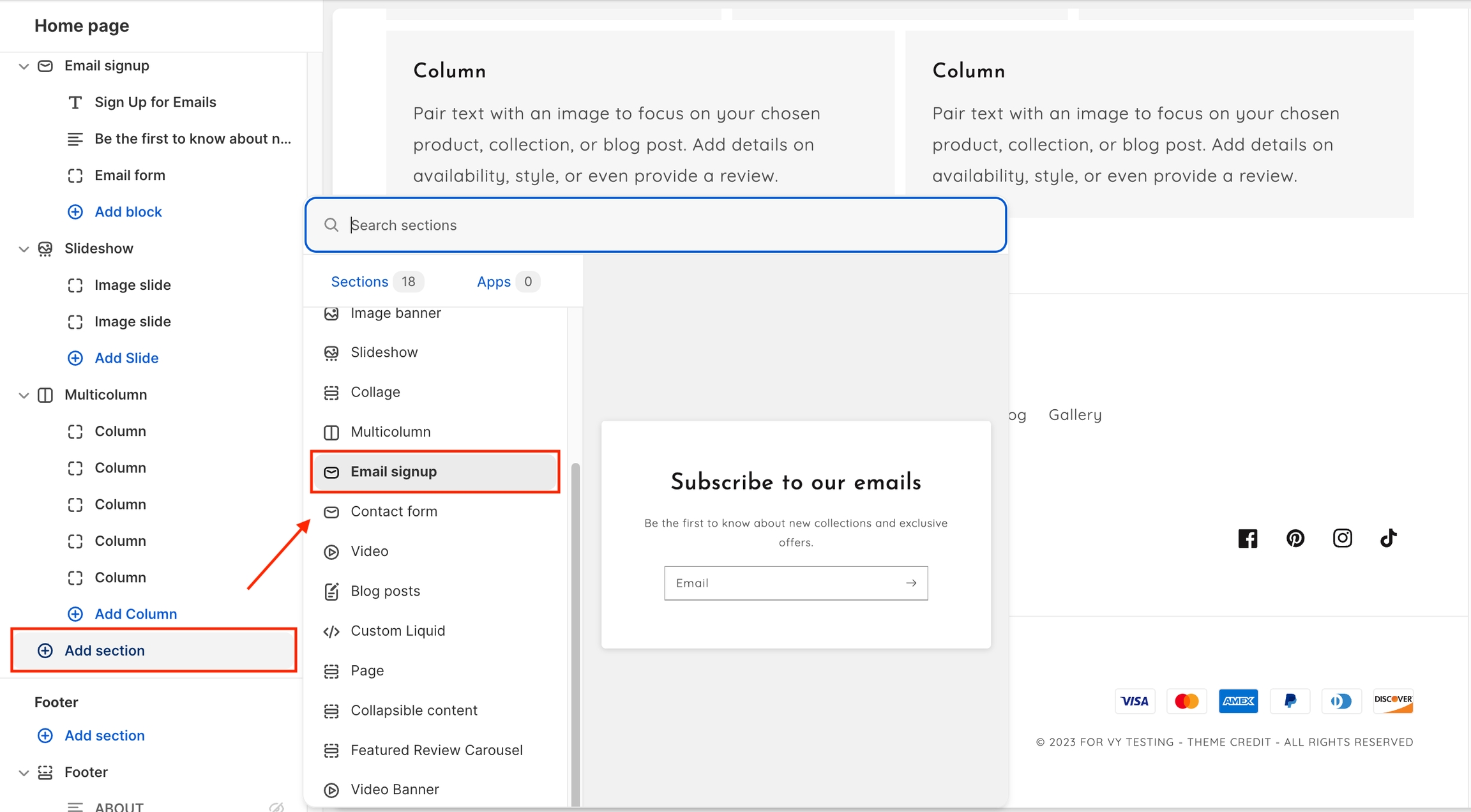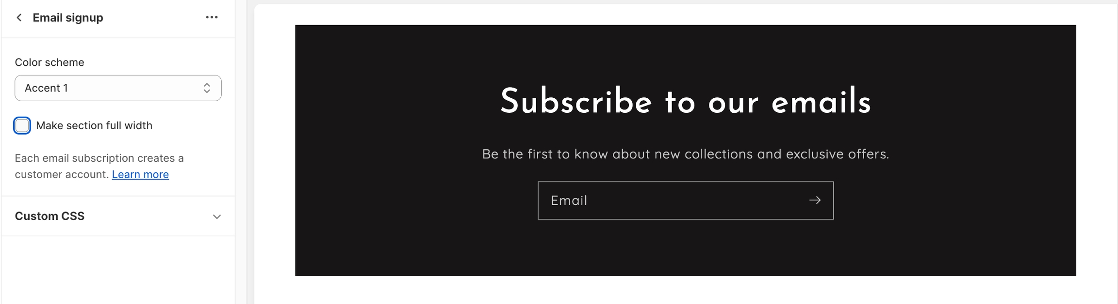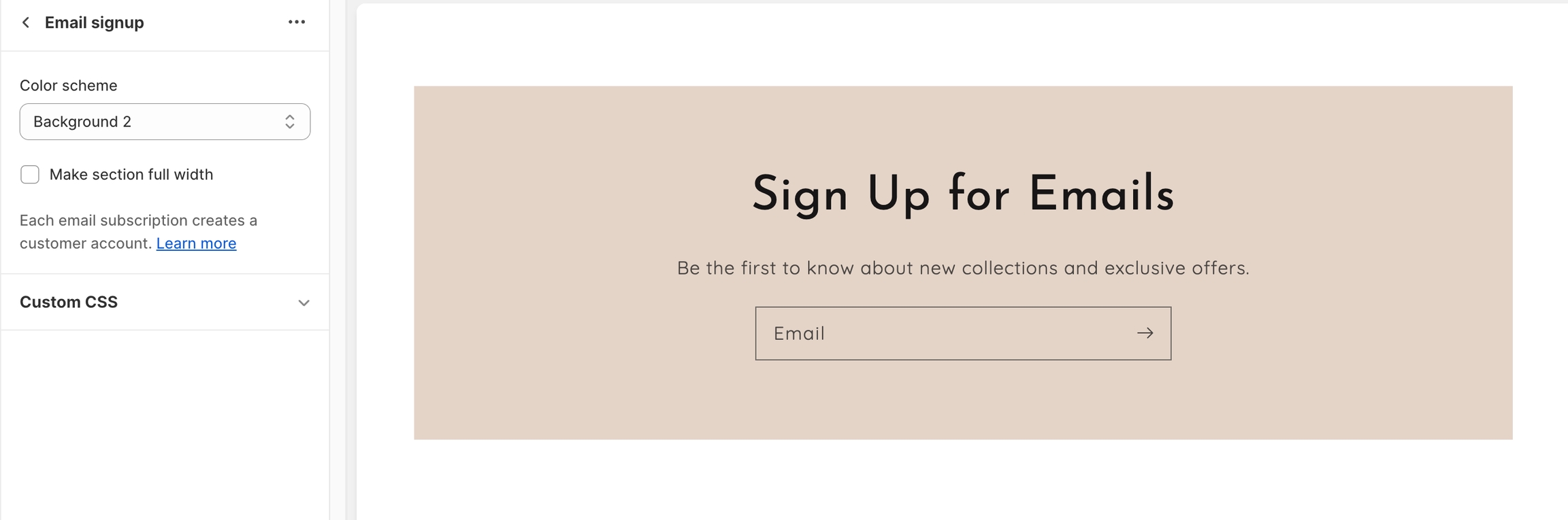 'Email signup' is an important section to add to almost any store. You need to set up an email signup to collect email addresses from people visiting your store.