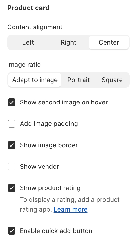 Product card: Choose the product card’s content alignment as you prefer and the image ratio. You can also enable/disable showing vendors and product rating and Enable quick add button in this section.