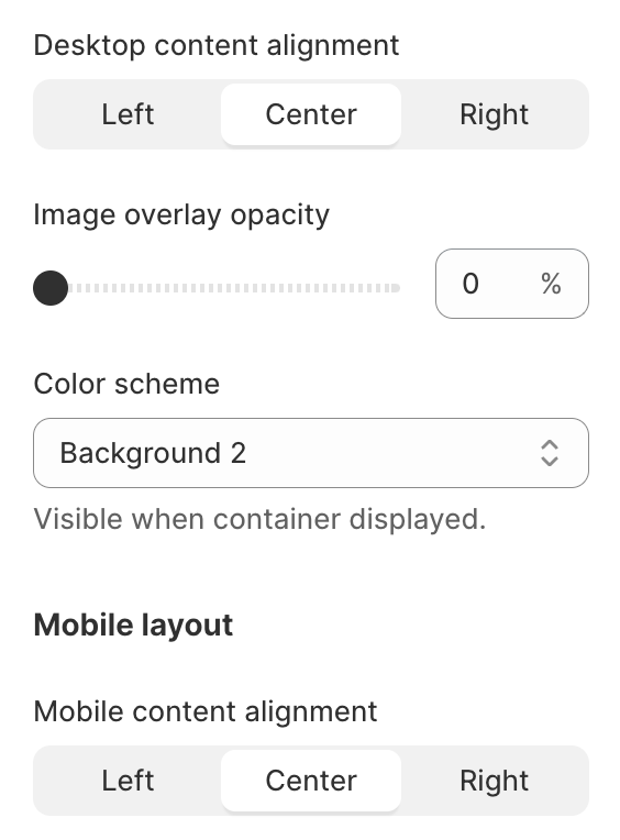 * You can change the **Desktop/Mobile content alignment:** choose between **Left**, **Center**, or **Right.**