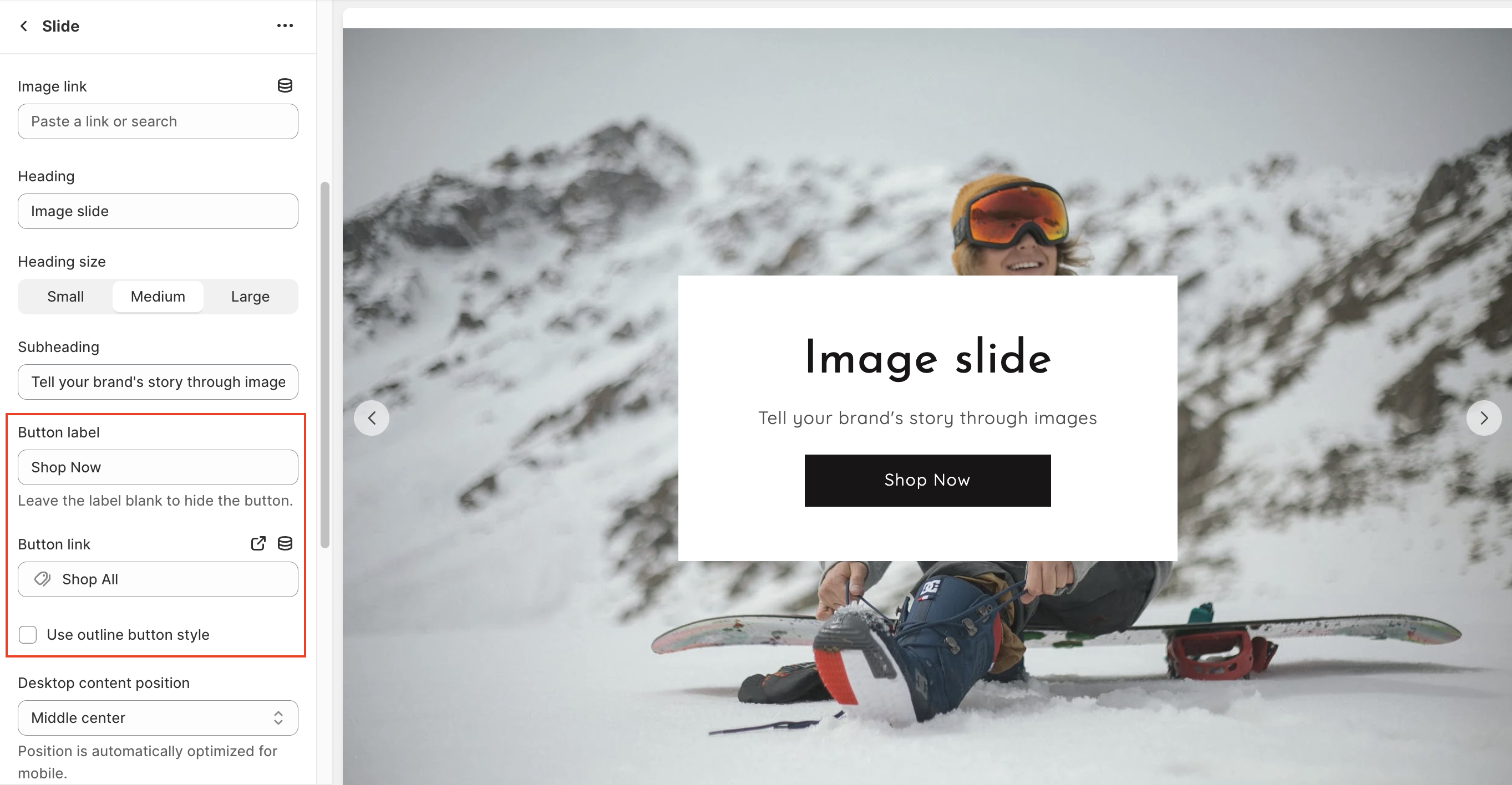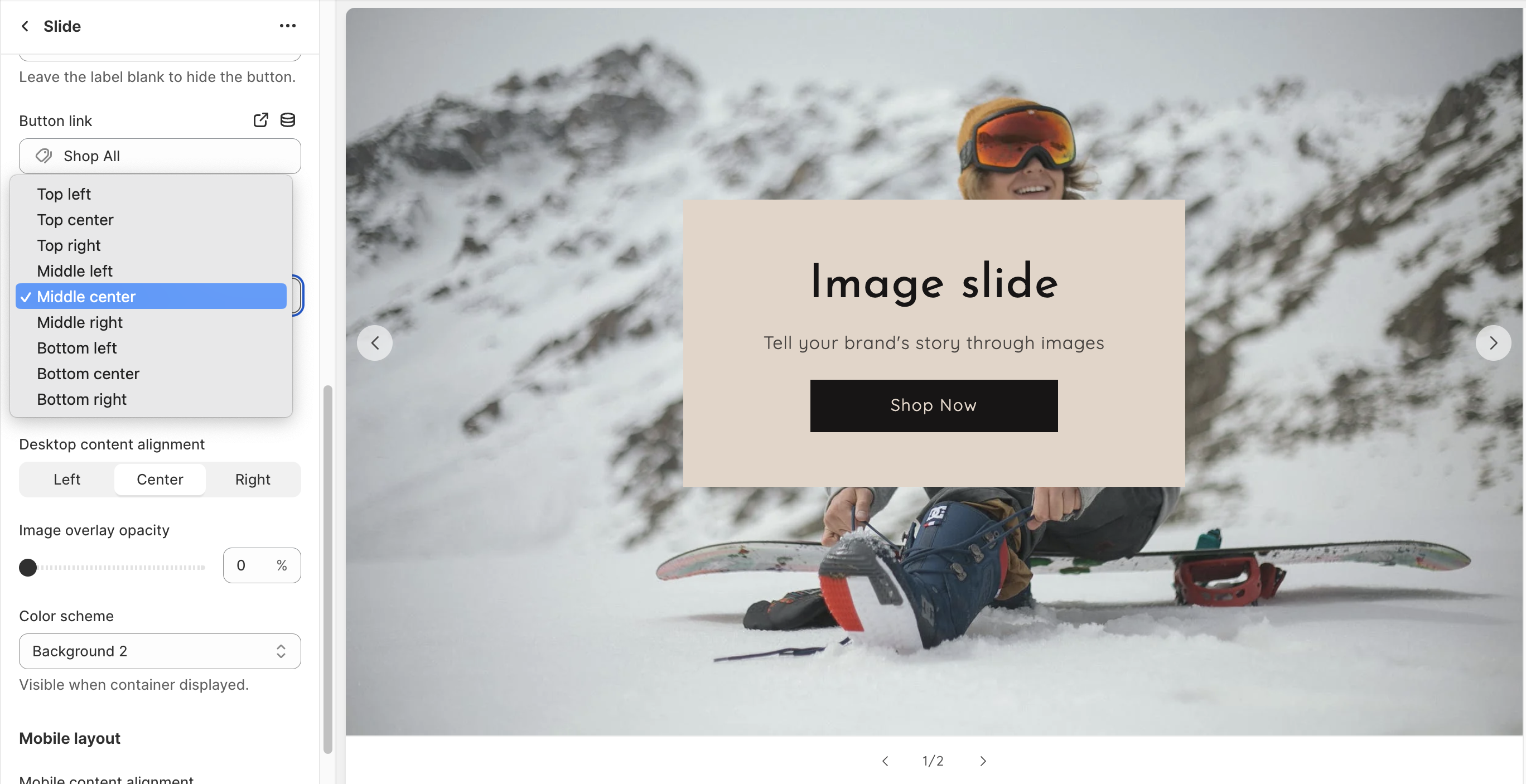 * You can use the dropdown options to change the **position** of the content on the Slide (desktop view). Available positions are Top left, Top center, Top right, Middle left, Middle center, Middle right, Bottom left, Bottom center, and Bottom right.