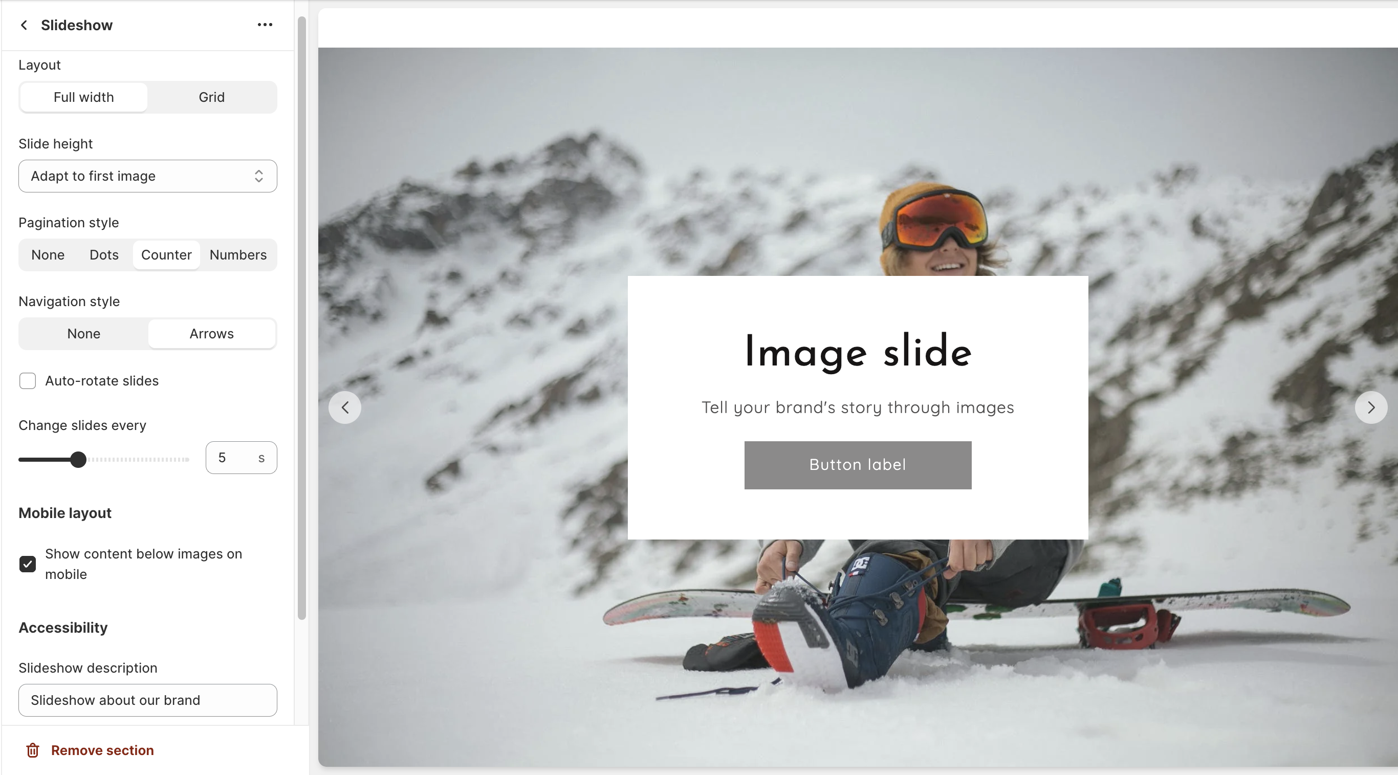 * Click on the **Slideshow** section to open the section settings.